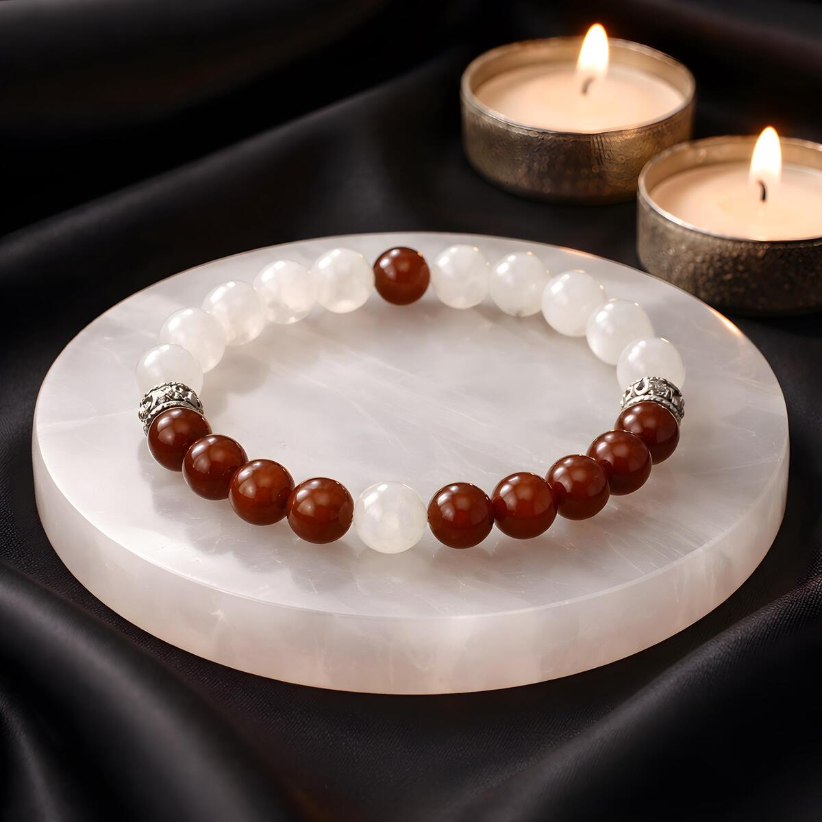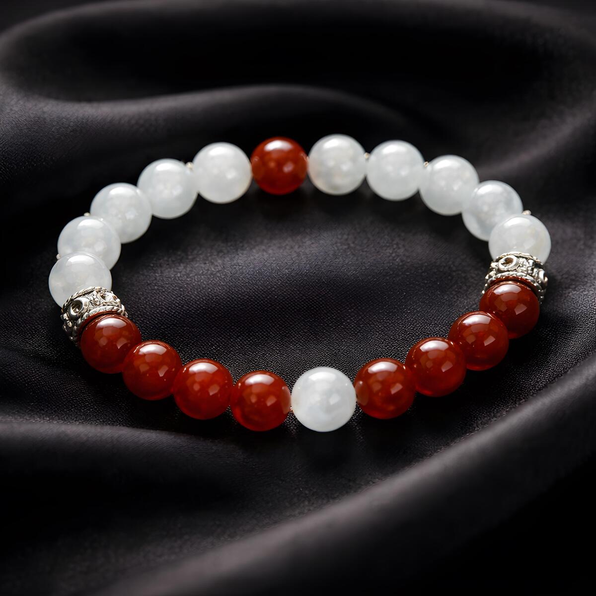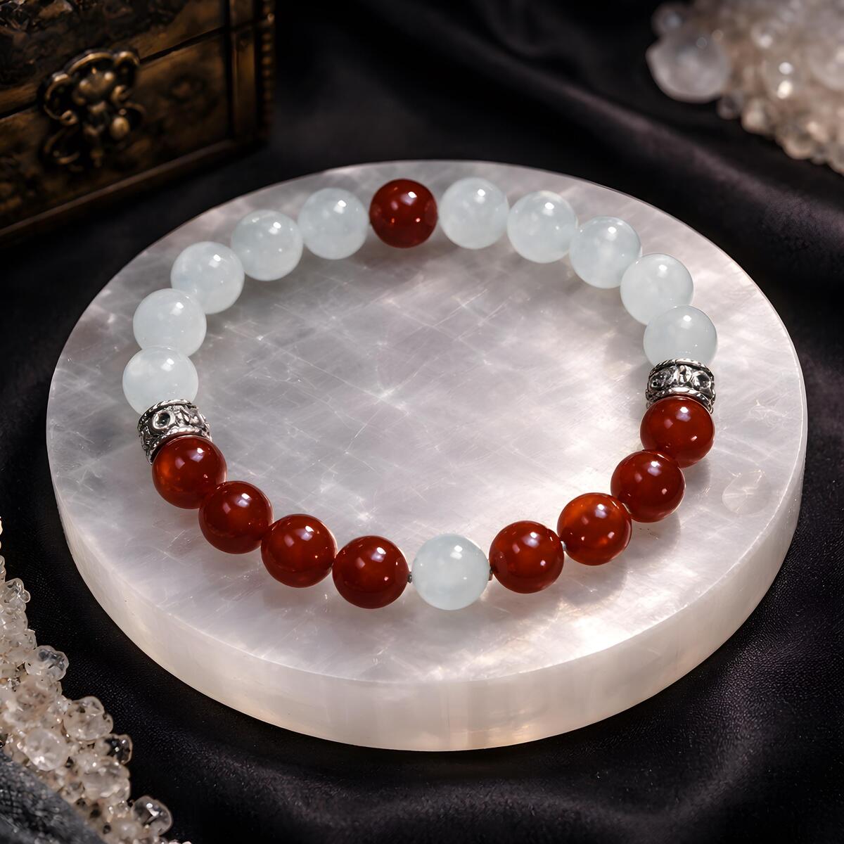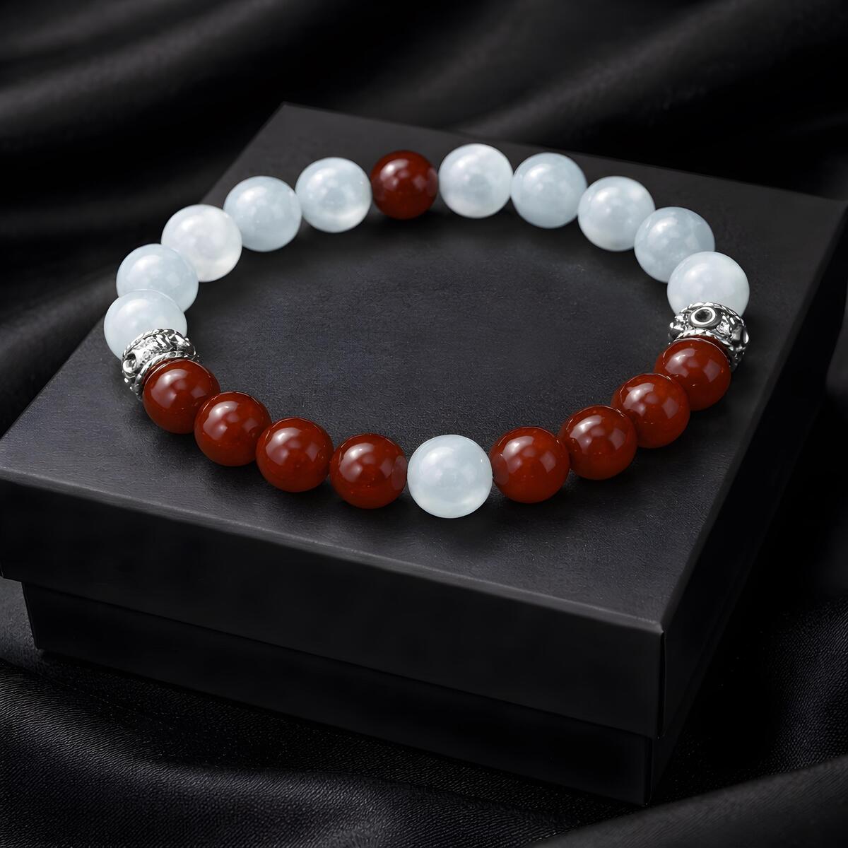 The Greenland Flag Color Gemstone Bracelet beautifully captures the essence of Greenlands striking landscape and rich history. Adorned with white moonstone beads, it symbolizes the vast glaciers and icy terrain that dominate the islands scenery, reflecting purity and resilience. The vibrant red carnelian beads represent the surrounding North Atlantic Ocean, embodying strength, vitality, and the life-giving waters that sustain Greenlands people. A single red carnelian bead in the center of the white moonstone strand echoes the setting sun dipping below the horizon, symbolizing hope and the promise of a new day. Conversely, a solitary white moonstone bead amid the red carnelian beads reflects the icy darkness of winter months and the enduring spirit of the Greenlandic people. Each gemstone resonates deeply with the inhabitants, embodying their connection to nature, land, and ocean. The red and white colors have long symbolized Greenlands ties to Denmark, highlighting centuries of cultural and political history. Wearing this bracelet is a tribute to Greenlands natural beauty, resilience, and shared heritage with Denmark. Its a meaningful accessory that honors both the lands majestic landscapes and its enduring cultural identity. This gemstone bracelet is more than jewelry its a symbol of Greenlands spirit and history.