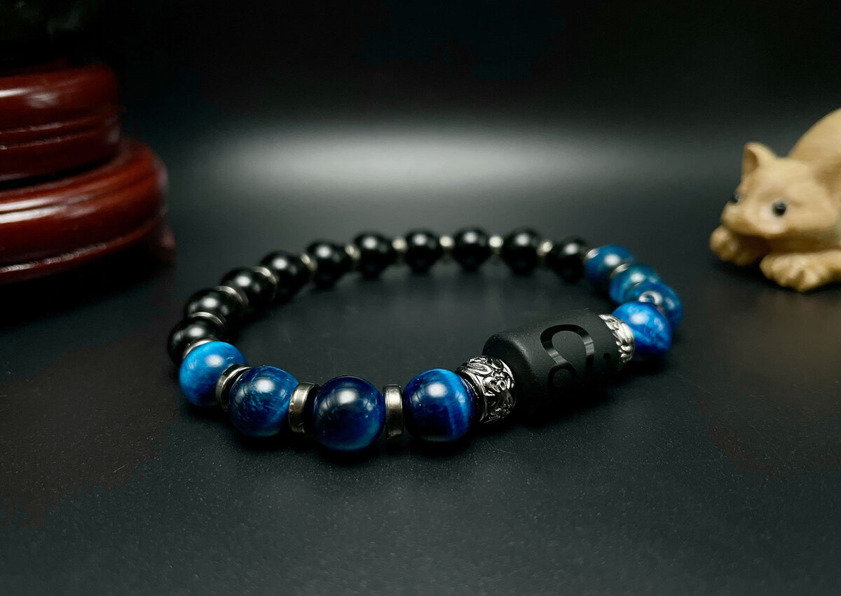 Leo Valor Zodiac Gemstone Bracelet, Blue Tiger Eye & Black Obsidian Beads
