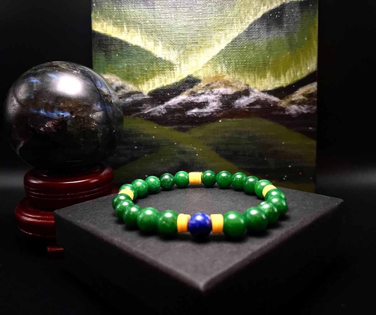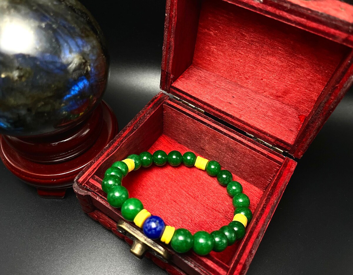 This gemstone bracelet represents the colors of the Brazilian flag. Colors consist of Green(Chalcedony), Blue(Lapis Lazuli), Yellow(clay beads).