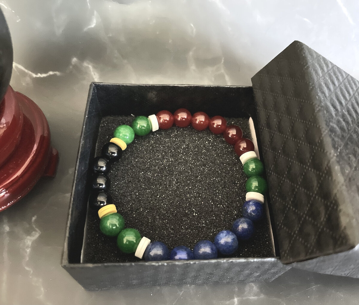 This gemstone bracelet represents the colors of the South African flag. Colors consist of Red(Carnelian), Green(Jasper), Black Pearl, Blue(Lapis Lazuli) where the Green beads represent "a convergence of diversity".