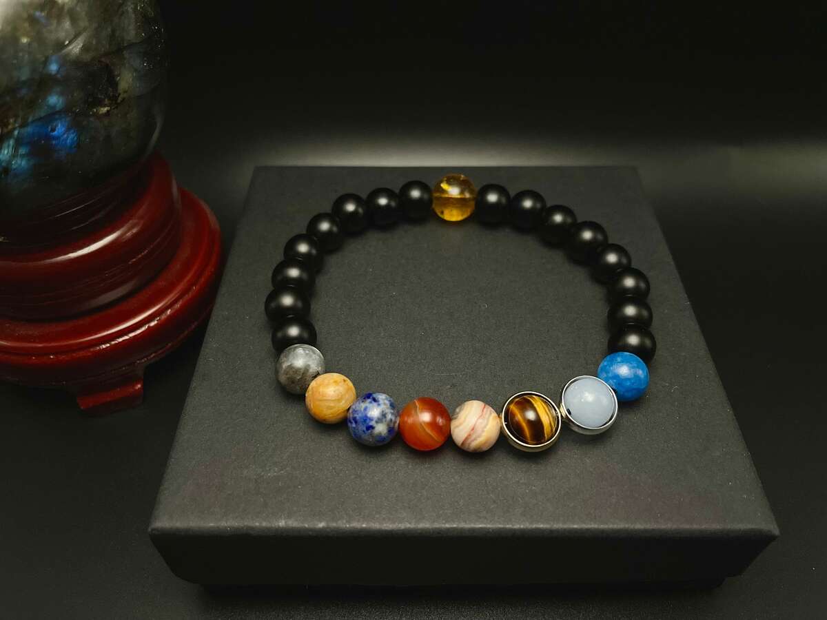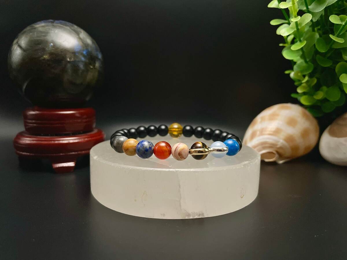 The Solar System Gemstone bracelet --- a stunning piece of jewelry that takes you on a journey through the cosmos. This unique and captivating accessory features eight planets, each represented by a different gemstone, carefully selected for its unique properties and beauty. The Mercury bead is made of Labradorite, adding a touch of mystique to the design. The Venus bead is crafted from Amazonite, exuding a sense of calm and serenity. The Earth bead is a stunning Lapis Lazuli, symbolizing wisdom and creativity. The bracelet continues with Mars in Carnelian, Jupiter in Crazy Lace Agate, Saturn in Tiger Eye with a gold plated ring, Uranus in Aquamarine with a silver plated ring, and Neptune in Kyanite. At the center of it all, the radiant Citrine bead represents the Sun(Sol), shining bright on the opposite side of the planetary beads. Matte black beads complete the design, adding a touch of sophistication to this celestial creation.