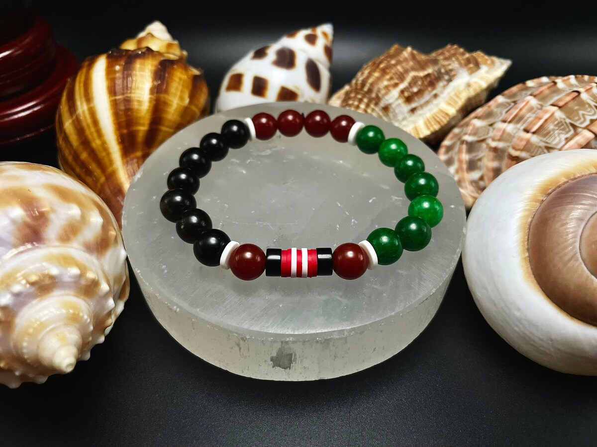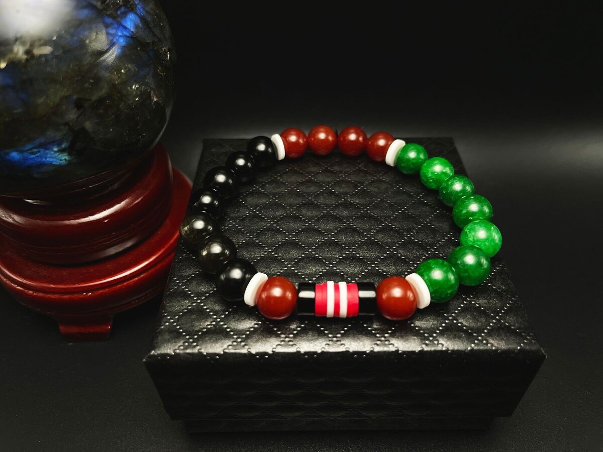 This gemstone bracelet represents the colors of the flag of Kenya. Colors consist of Green(Chalcedony), Red(Carnelian), Black(Obsidian) with the center black barrel and red/white clay beads representing the shield with spear/arrow emblem.