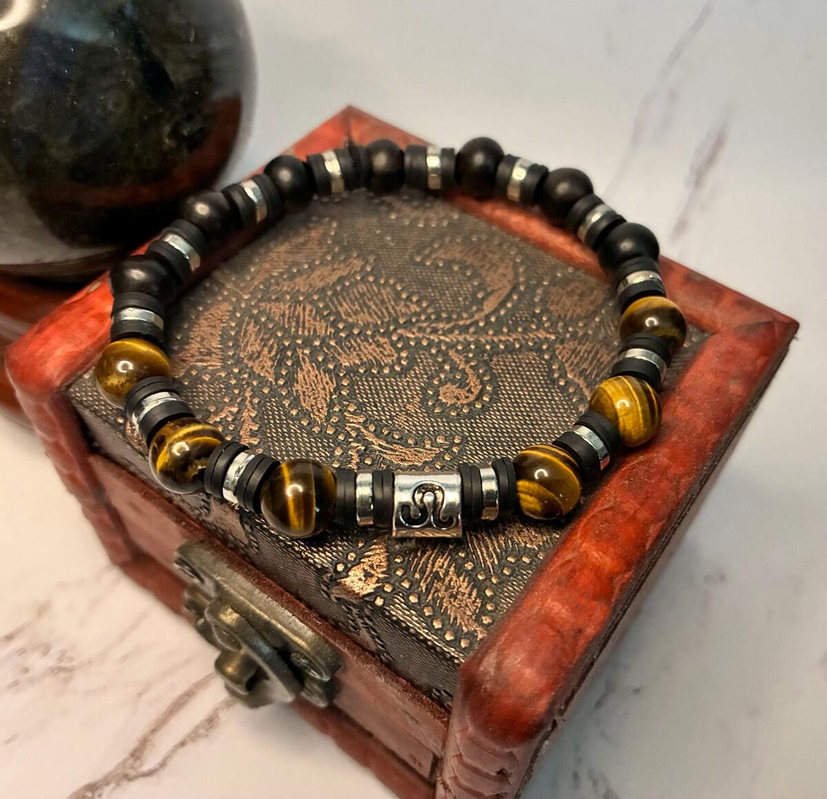 The Leo Zodiac Bracelet is a stunning accessory that beautifully combines meaningful symbolism with elegant design. Crafted with Tiger Eye gemstone beads and dark wood beads, it offers a rich contrast that enhances its visual appeal. A silver charm featuring the Leo zodiac symbol adds a personalized touch, making it perfect for those born under this fiery sign. The black and silver spacers placed between each bead create a balanced and sophisticated look. The warm, golden hues of Tiger Eye resonate with Leo's traits of confidence, courage, and vitality, making it a perfect match for the zodiac's energetic personality. Leo's amazing and beautiful qualities include their natural leadership, generosity, and vibrant enthusiasm. This bracelet not only serves as a stylish accessory but also embodies the powerful and radiant spirit of the Leo sign.
