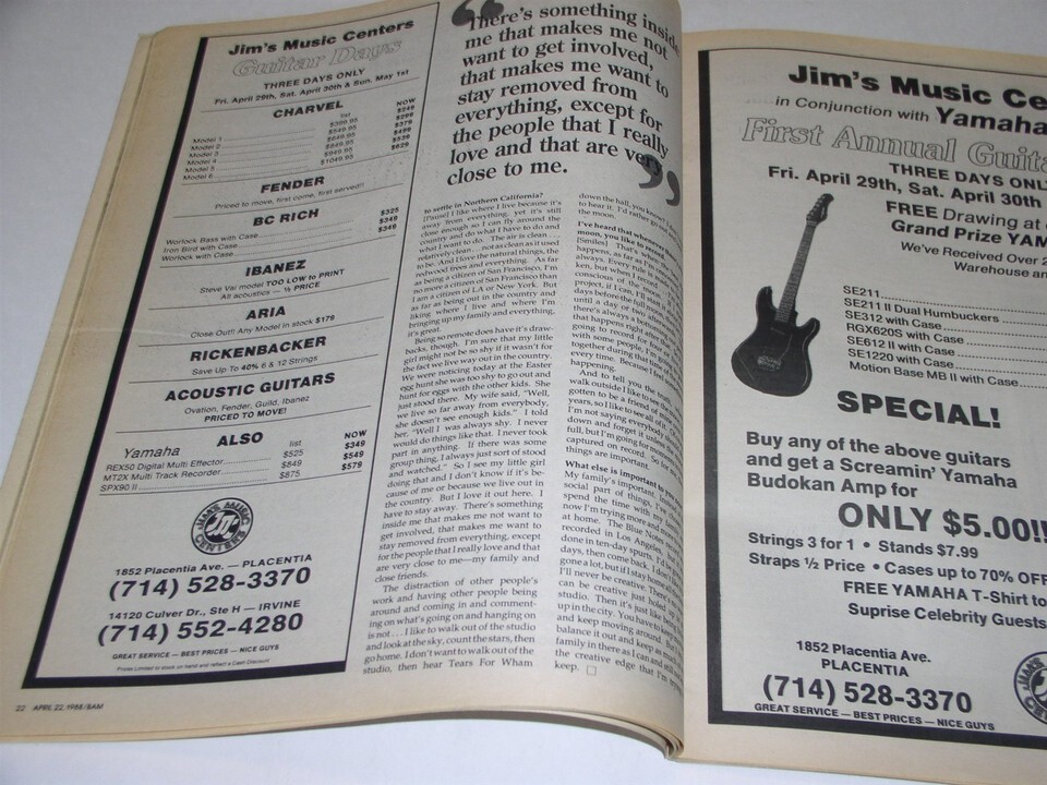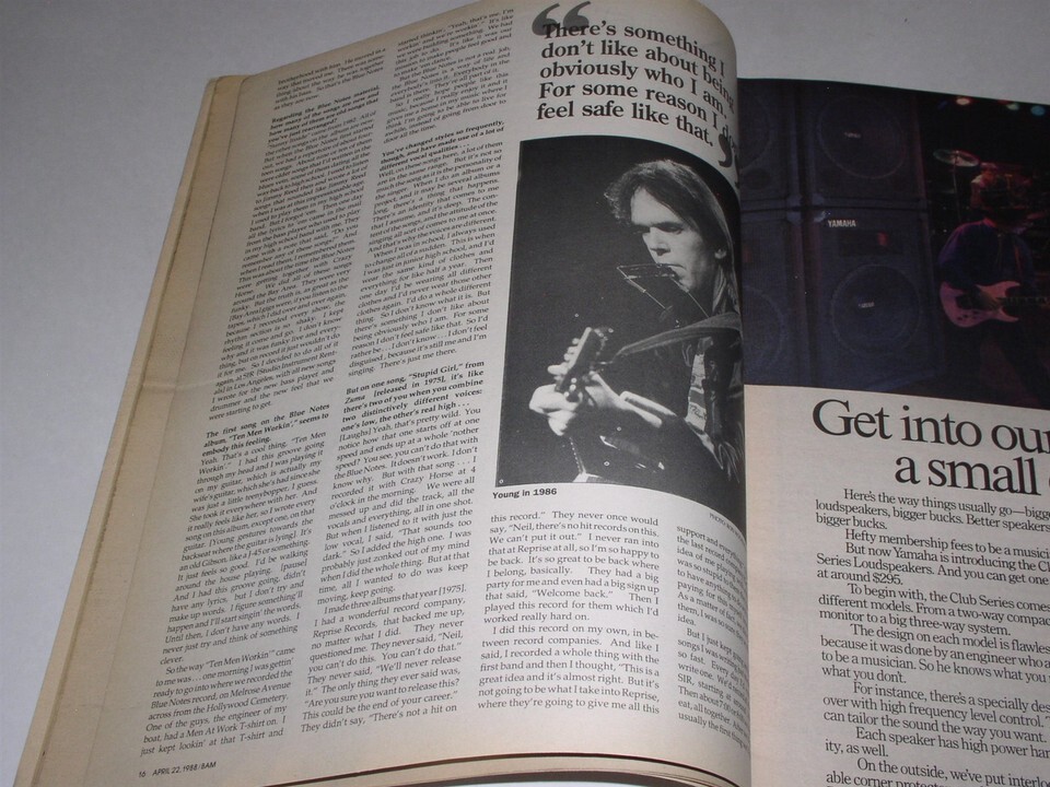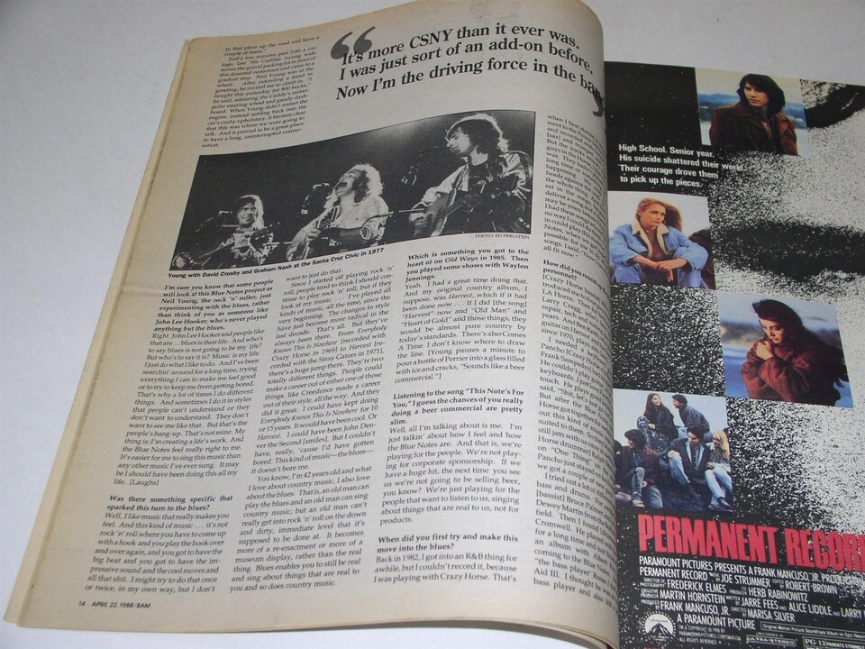 This is the April 22, 1988 issue of "BAM" magazine. Cover story on Neil Young. Inside: Celebrity Attractions Billy Idol Meet Joni Mitchell and Kid Creole Meets Barry Manilow, Guitar Buyers Guide. A terrific item for the fan or collector.