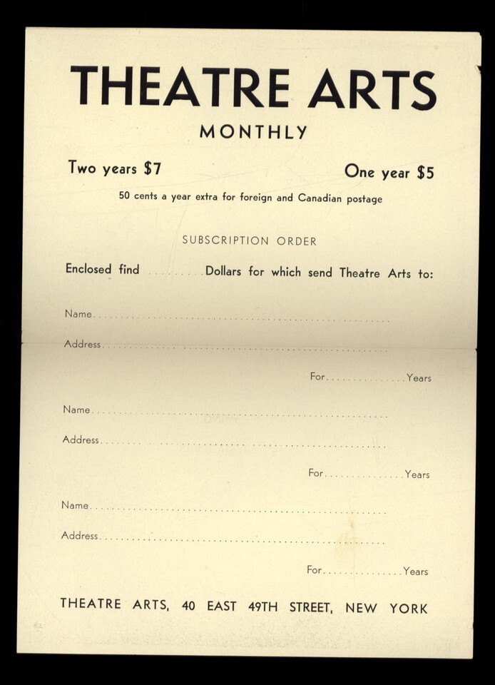 FOUND in BOOK - SUBSCIPTION ORDER for THEATRE ARTS monthly Magazine 4 x 5-3/4