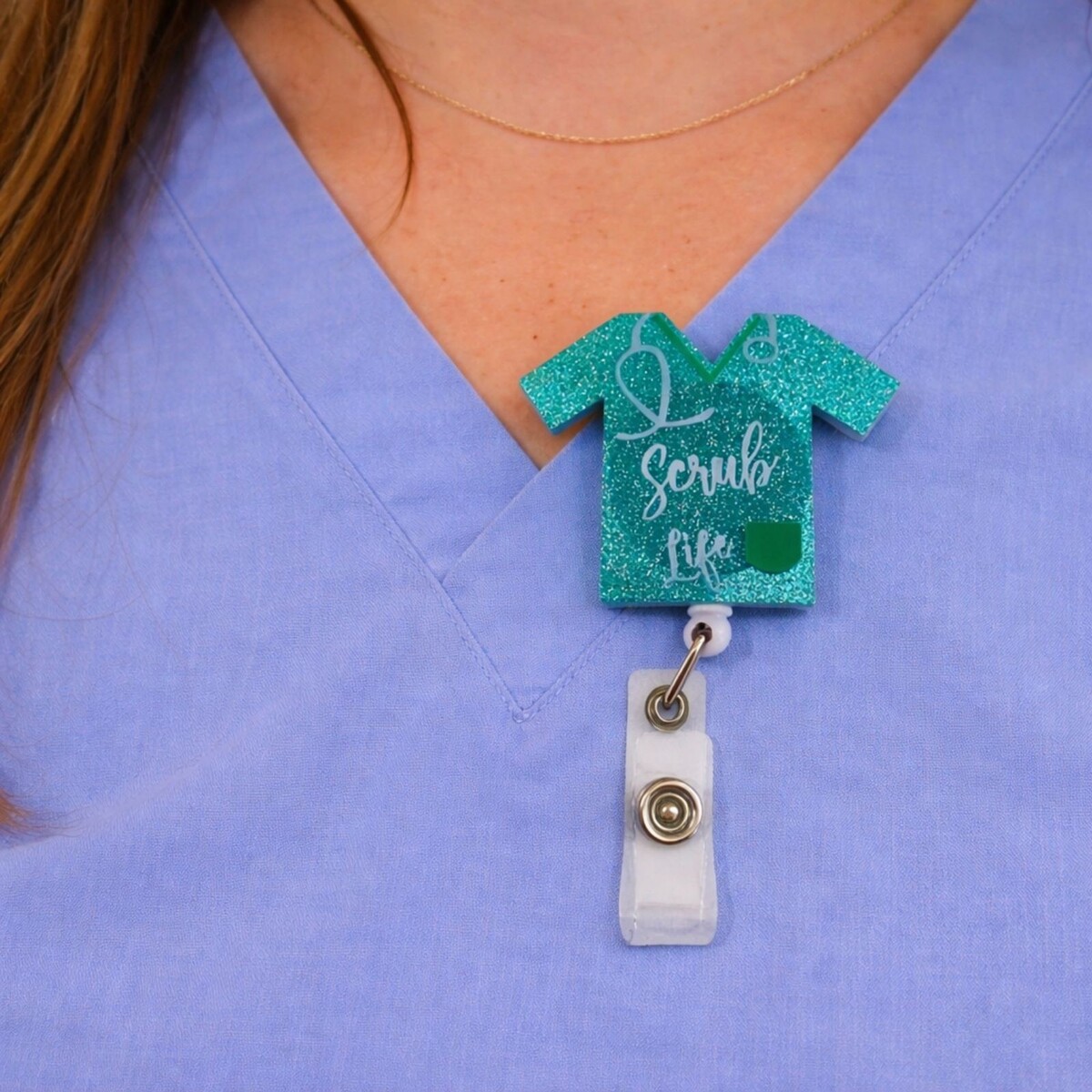 Fun and sparkly ?Scrub Life? badge reel designed in the shape of a scrub top with a stethoscope graphic. The silver glitter finish adds personality to everyday work wear while the retractable reel keeps your ID easily accessible. Features a rotating alligator clip on the back for secure attachment to scrubs, pockets, or lanyards. Perfect for nurses, medical assistants, dental staff, hospital workers, and healthcare students who want a little style on their badge.