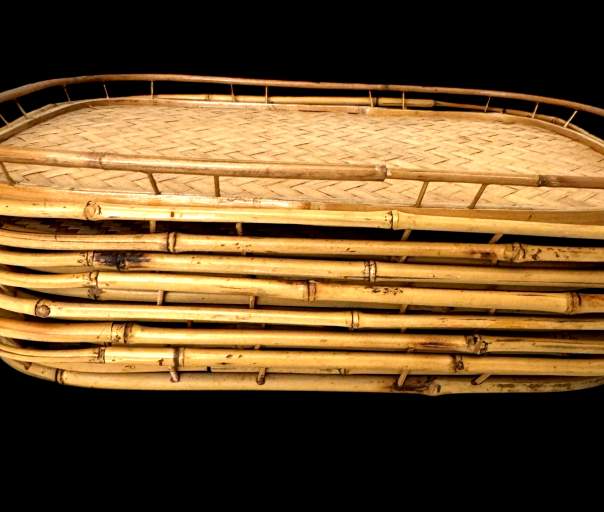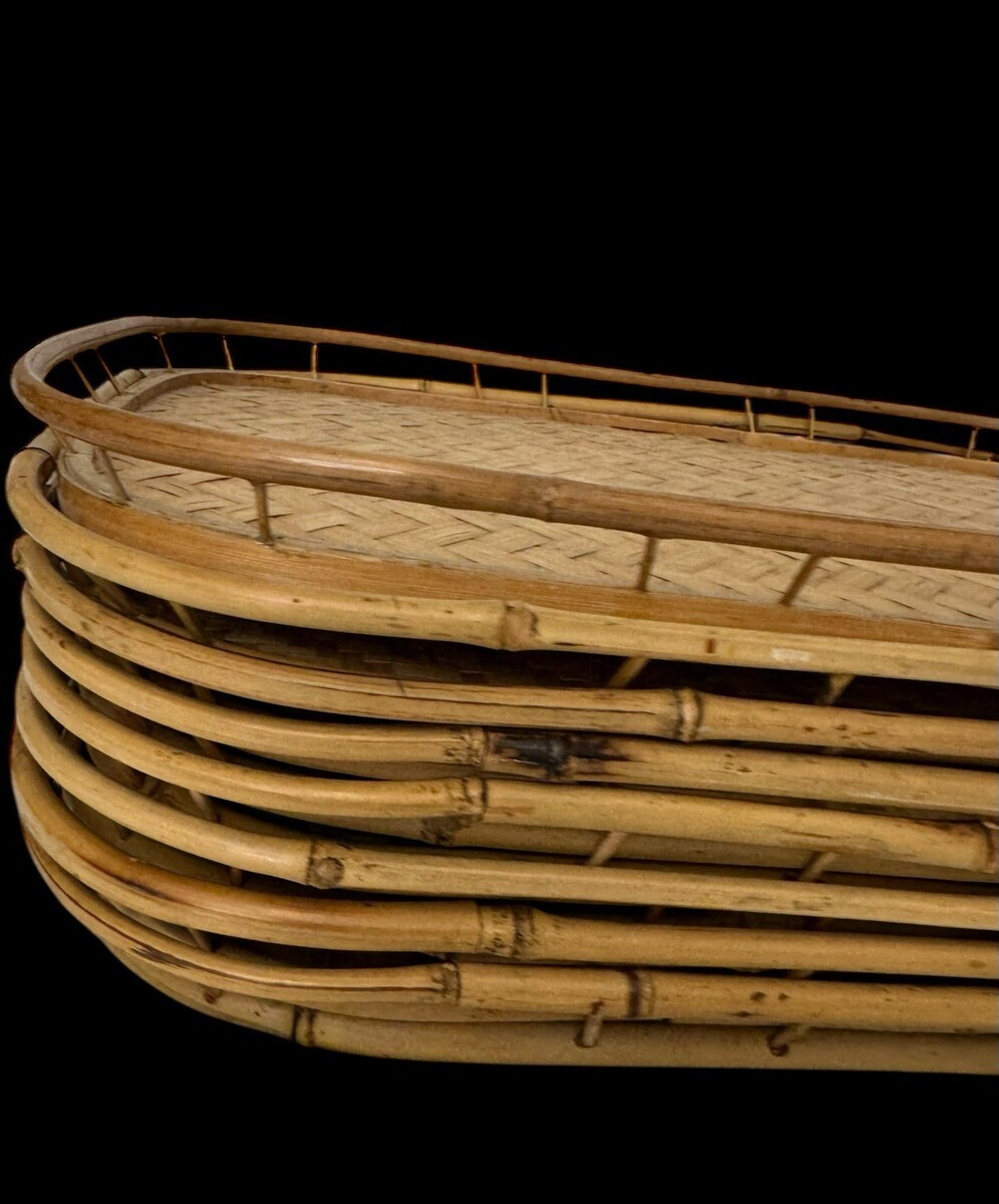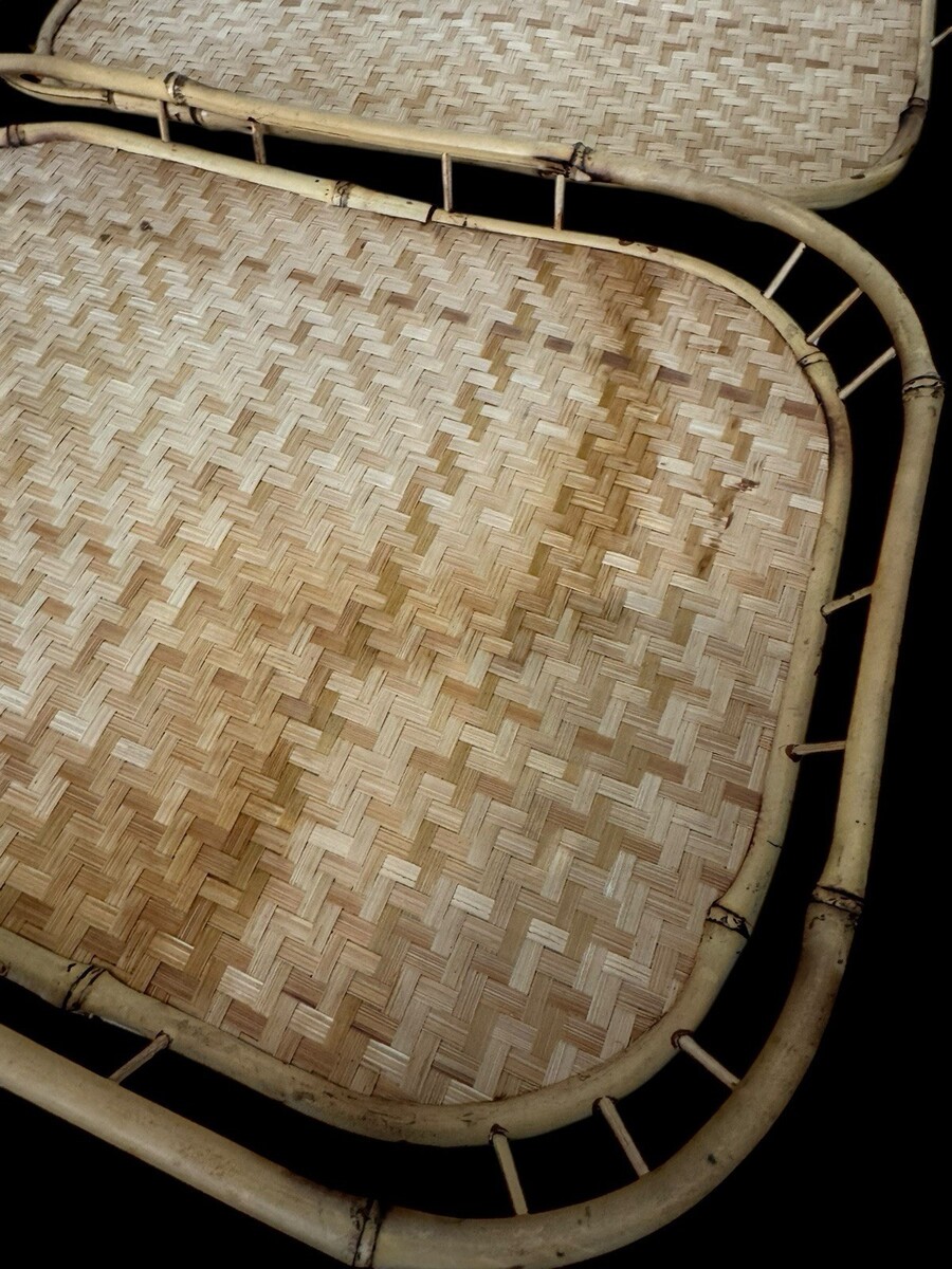 Vintage Bamboo Rattan Serving Tray Set 8 Rectangular Woven Raised Rim Tiki Boho