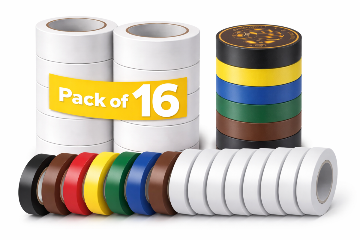 10 Rolls of White Electrical Tape + 6 Rolls of Multi-Color Electrical Tape (Total 16 Rolls)