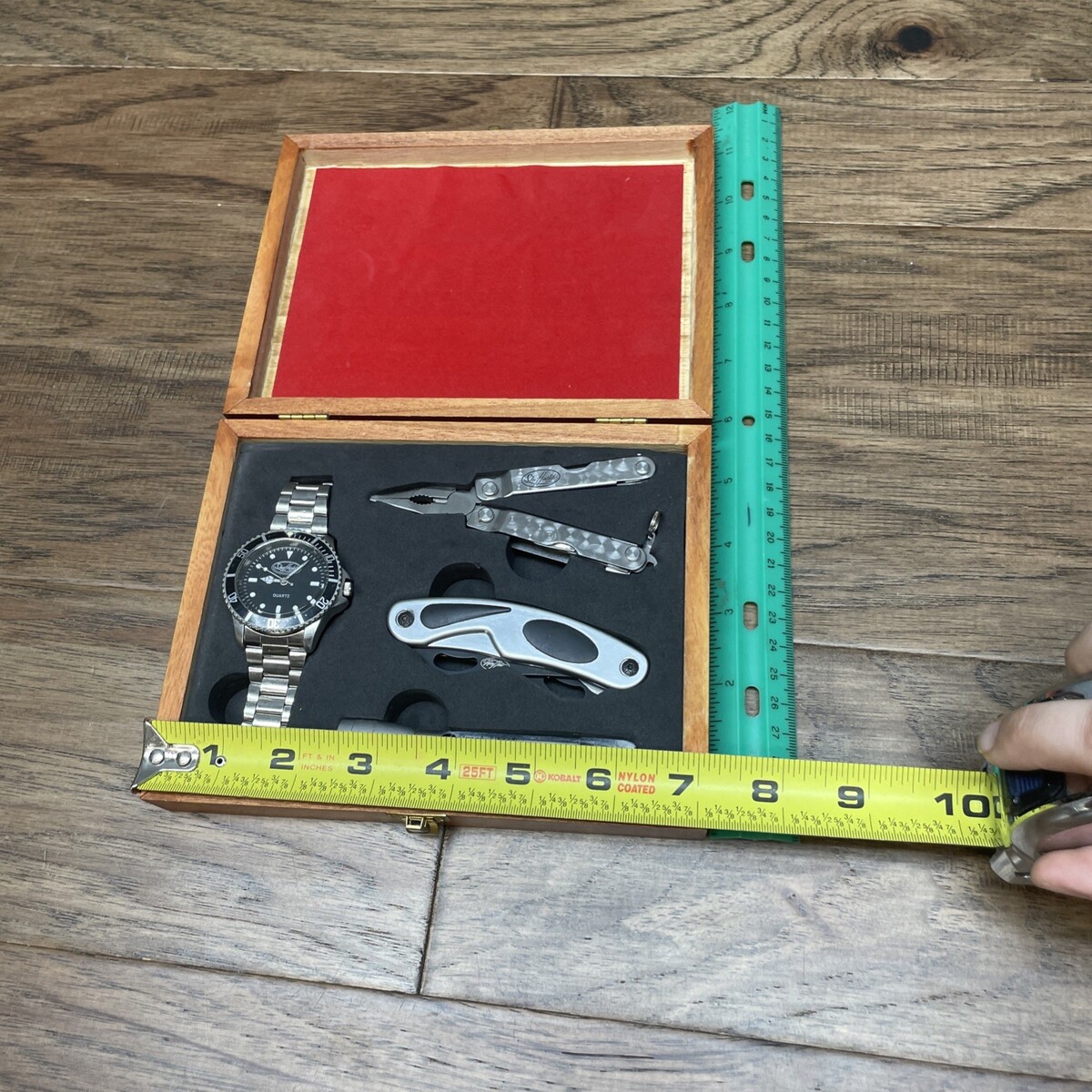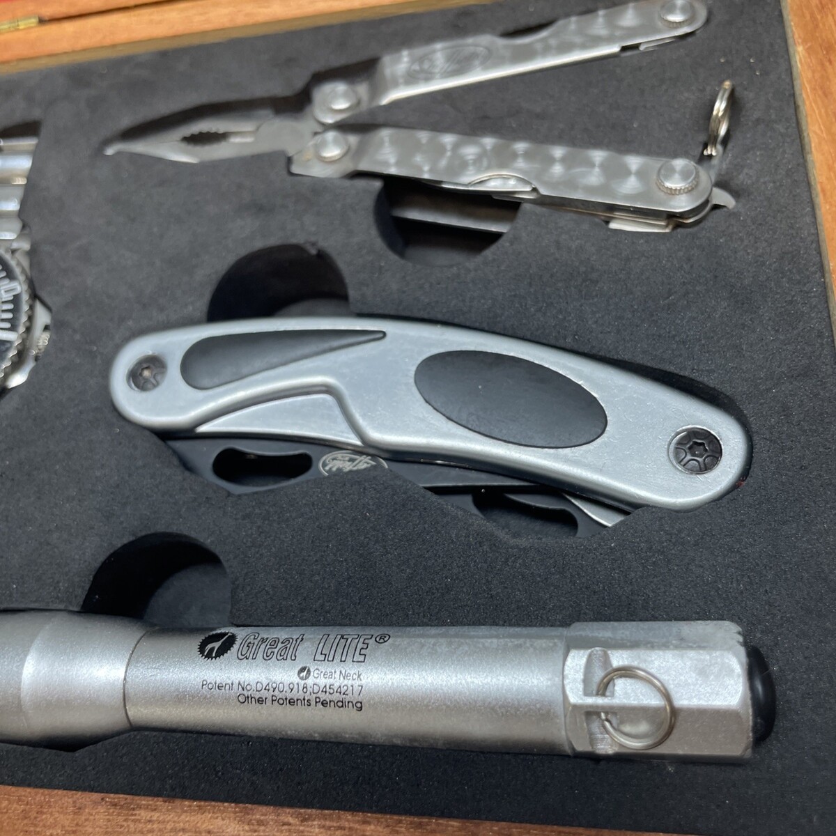 Sheffield MFG Knife Multitool Flashlight Set With Watch Wooden Case JD AP
