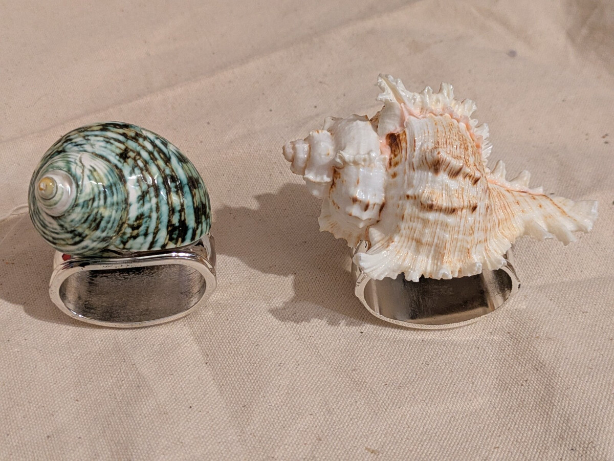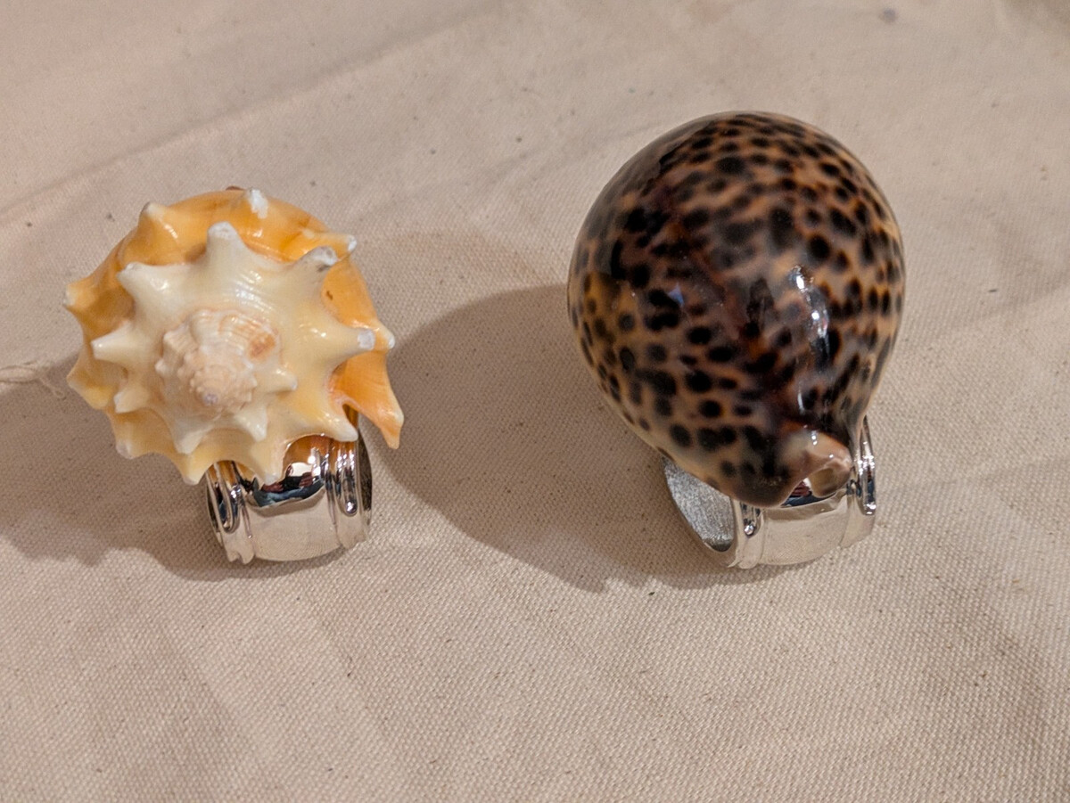 Set of 4 Hans Turnwald Seashell Silver Plated Napkin Rings in a red box. The napkin rings feature a shells pattern and are made of sea shell material. They are part of a collection of 4 items, adding a beach decor touch to your dining table. The design is original and colorful, making them a charming addition to your kitchen linens and textiles.