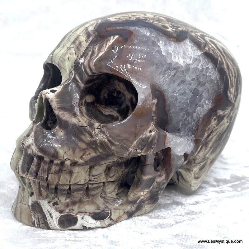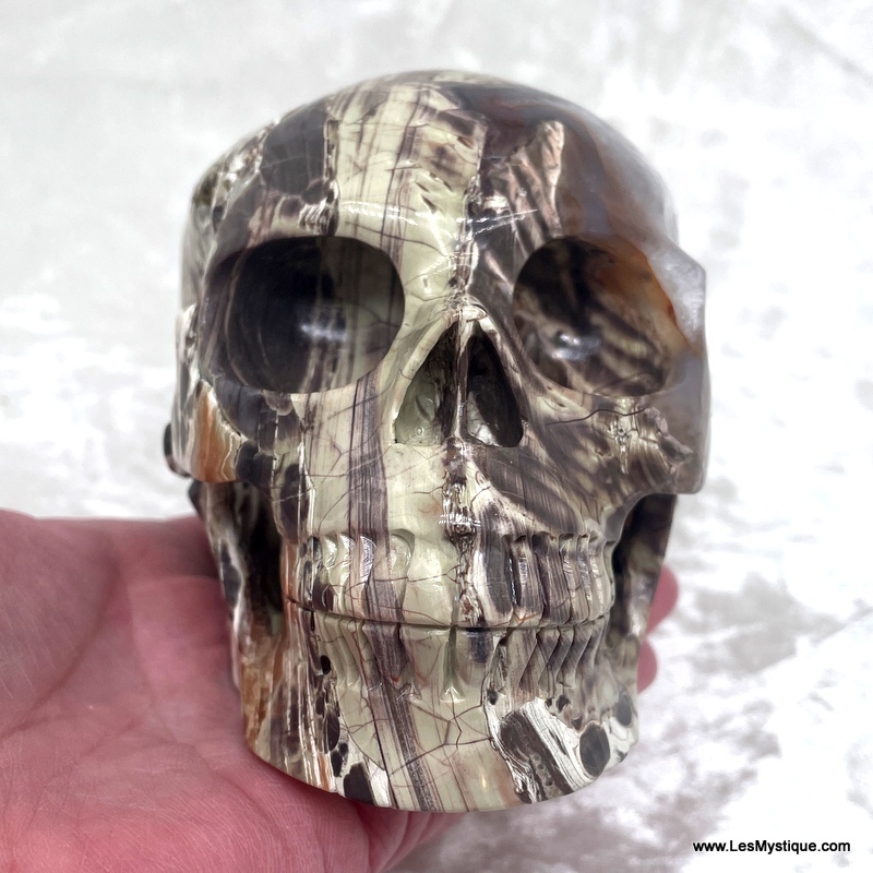 Gorgeous panther jasper, slightly elongated crystal skull in dramatic shades of rich brown, snow white and light olive green with quartz area. There is a natural area /dip on the left side.