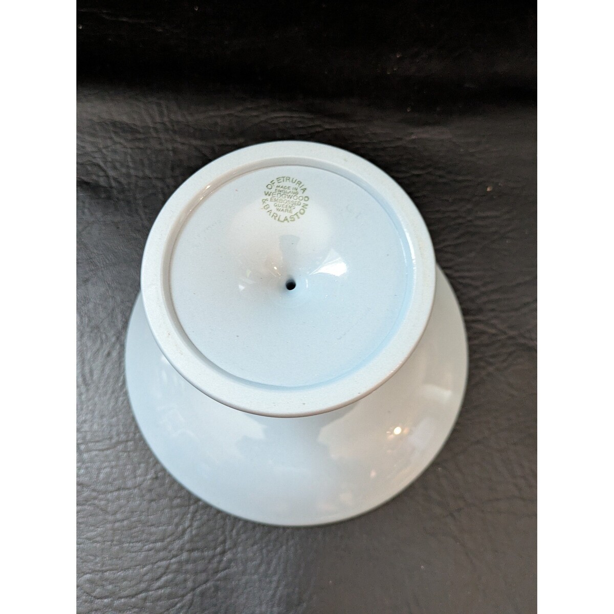 Wedgwood Embossed Queen's Ware lavender blue pedestal cake stand or compote dish. This elegant piece features a classic white grapevine relief border on a soft blue glazed ground. Crafted in England, it showcases the refined craftsmanship of Etruria and Barlaston. The pedestal base mirrors the ornate vine motif, making it a sophisticated addition to any high tea service or vintage-inspired table setting. Perfect condition. No chips or cracks. Measurements: ? Diameter: 6.25" ? Height: 3.5"