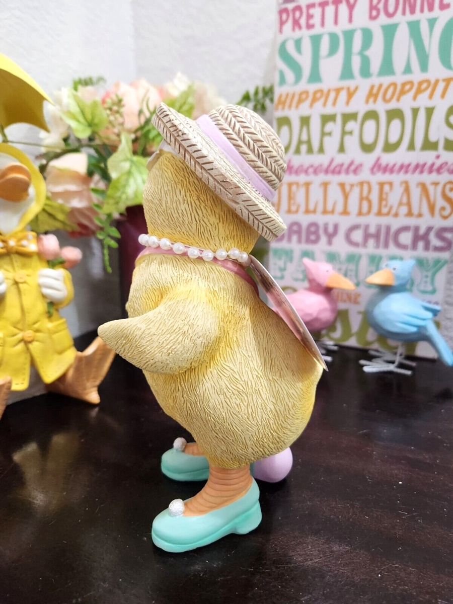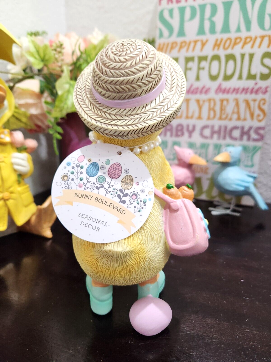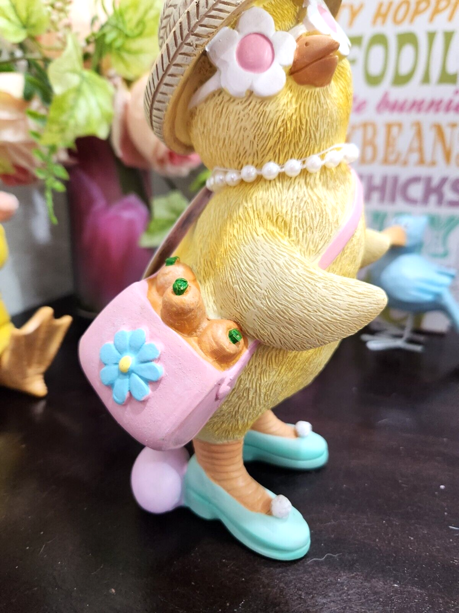 Up for sale we have this uper cute chick for your Easter tabletop decor. She is soooo cute!! She is wearing sunglasses and holding purses and around her neck is faux pearl necklase. She will look amazing anywhere you place her. Made of resin and they stand approx 8" tall. New.