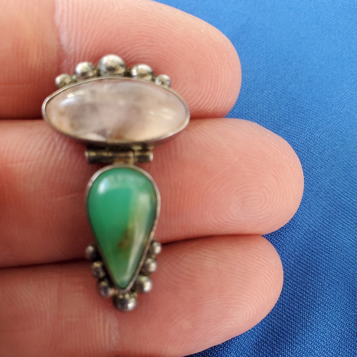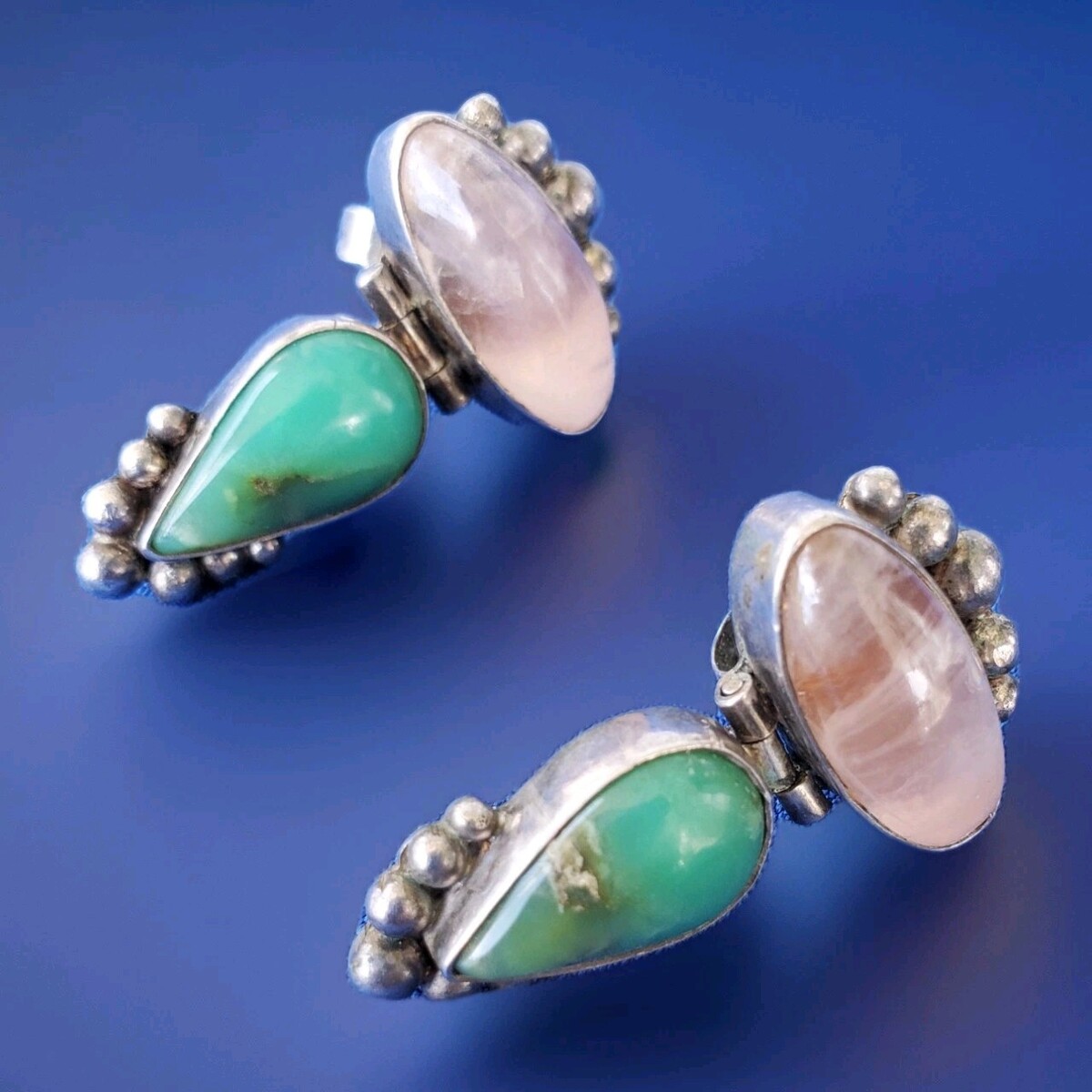 Vintage original geometric style rose quartz and chrysoprase 925 sterling silver earrings.