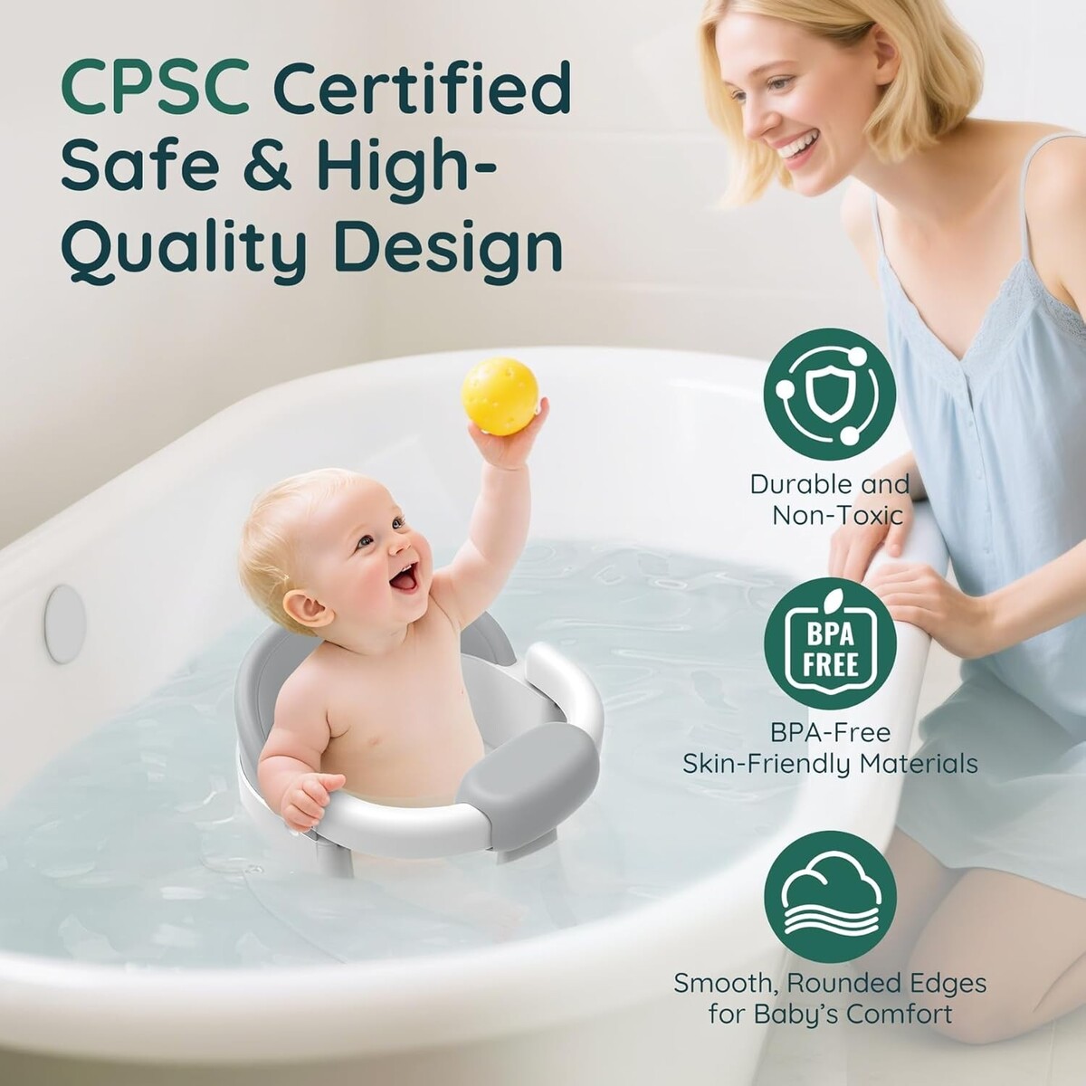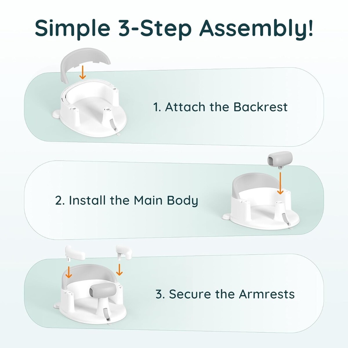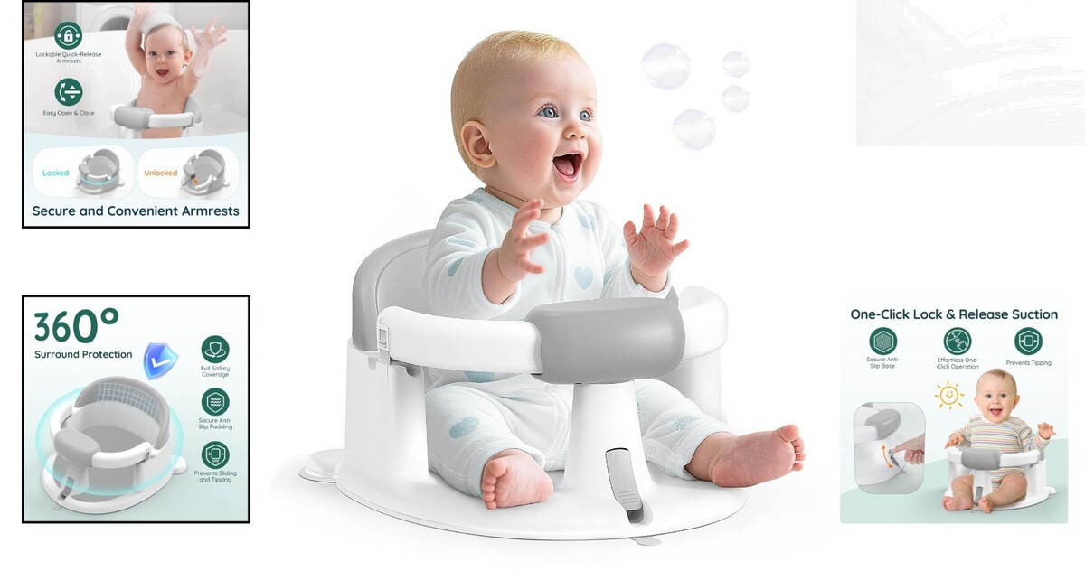 Stable Secure: Reinforced armrests lock securely to keep your little one safe during bath time, while a 360 wraparound frame and anti-slip seat cushion provide additional support.