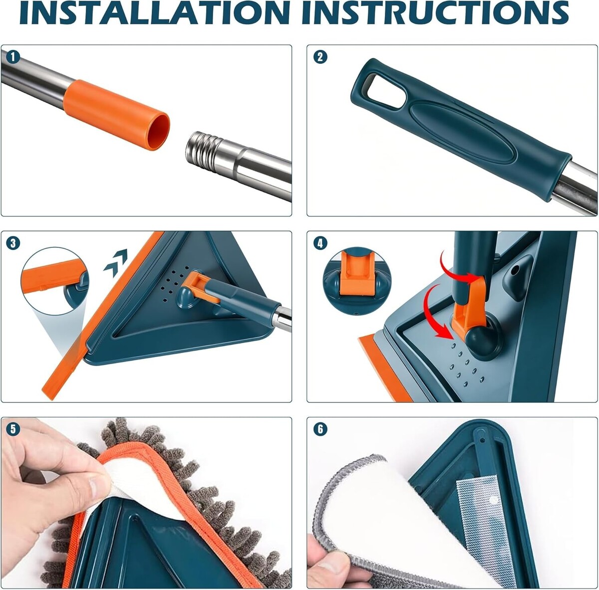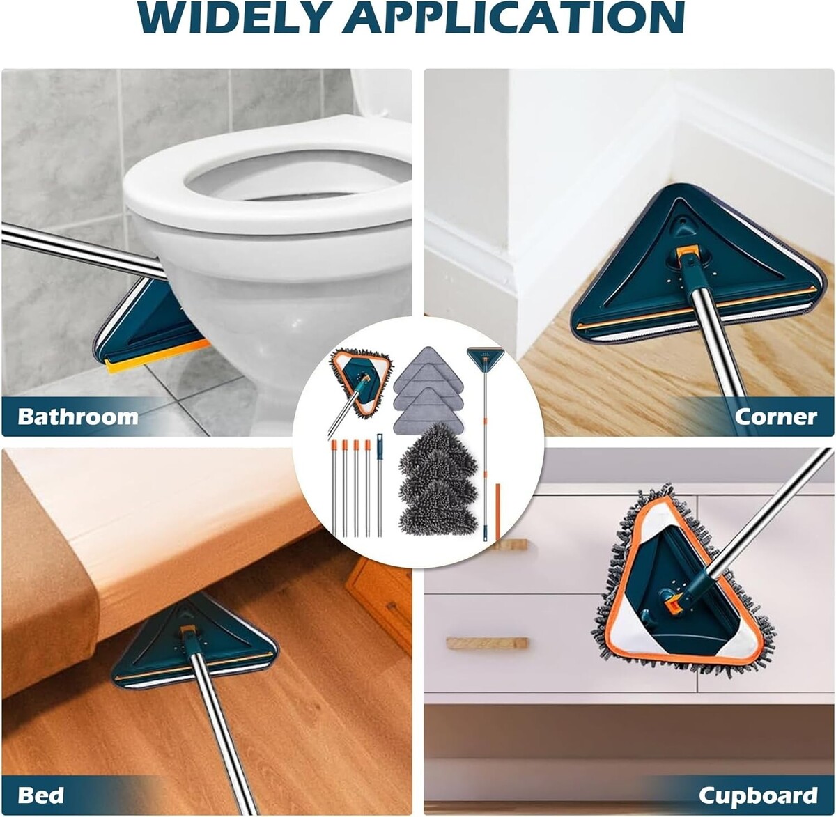 360 Swivel Head Design: The triangular mop head adjusts to any angle, providing access to dead corners and hard-to- areas while ensuring stability with a locking function.