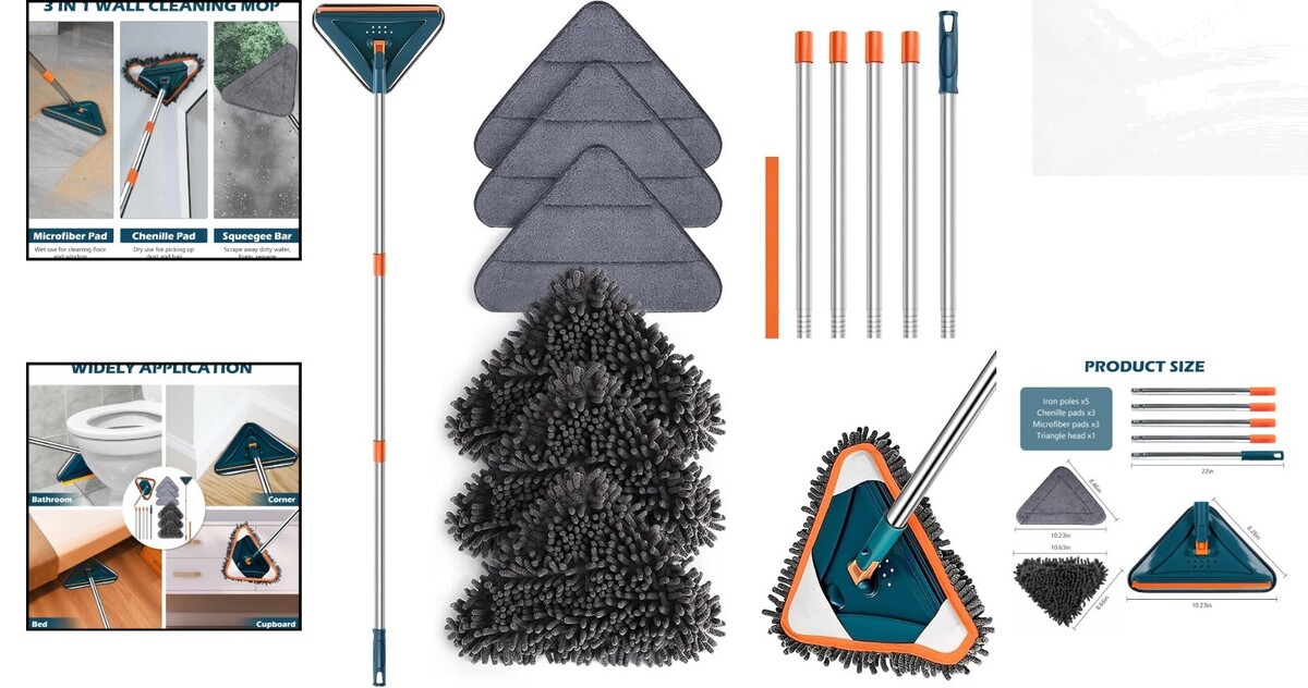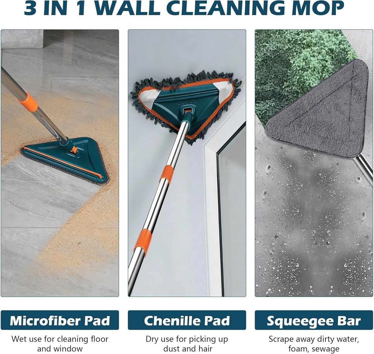 Wet Dry Mop for Walls: Equipped with chenille pads for dusting dry surfaces and microfiber cleaning pads for soaking up grime, perfect for any cleaning need.