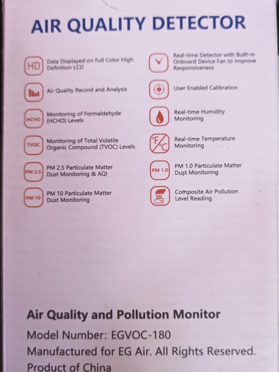 The EG Air Quality Monitor, Formaldehyde Detector, Pollution Meter, Sensor EGVOC-180 is a reliable and efficient tool designed to measure air quality levels with precision. This product includes sensors for PM2.5, TVOC, and HCHO, providing comprehensive monitoring capabilities. With the brand reputation of EG, users can trust in the accuracy and quality of the measurements obtained from this air quality monitor. Perfect for business and industrial applications, as well as personal use in ensuring clean and healthy air environments.
