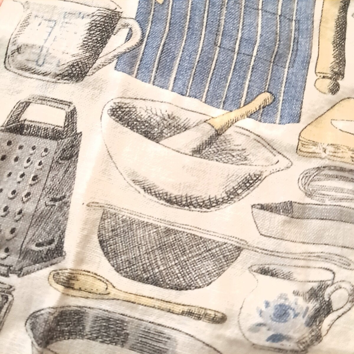 Vintage National Trust tea towel Kitchen Utensils Pat Albeck Irish linen cat