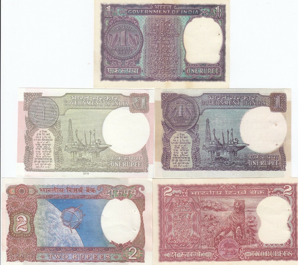 INDIA 5 PCS LOW SERIAL BANKNOTES SET (1+1+1+2+2 RUPEES), RANDOM YEAR, UNC