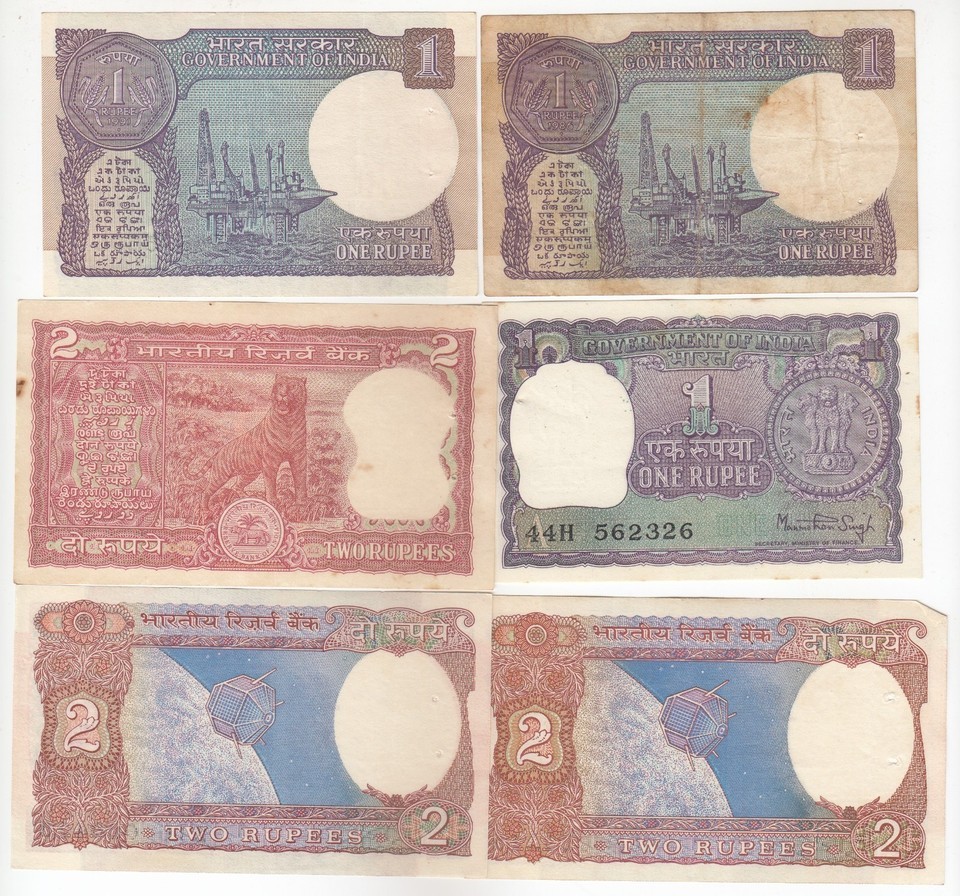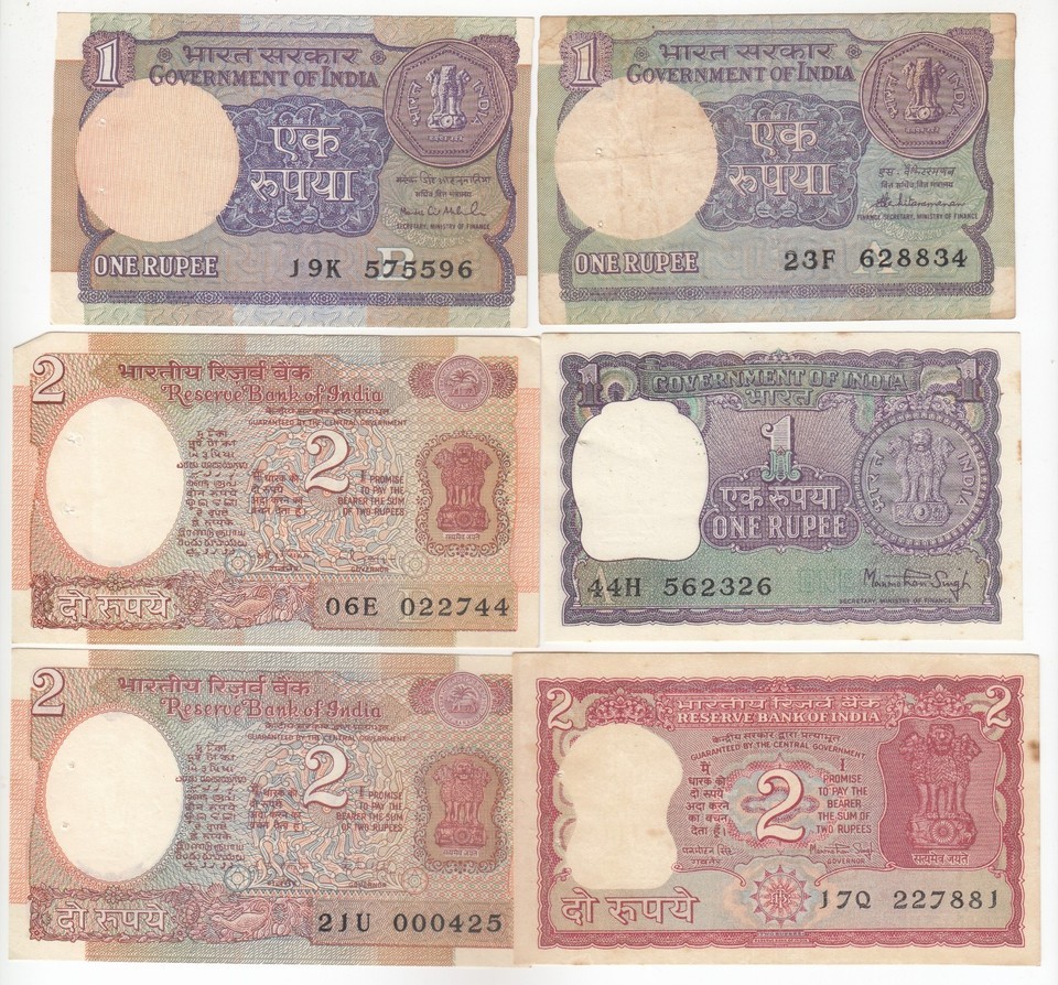 India, 1, 2 Rupees Set of 6, All Different Sign Old Issues Banknote
