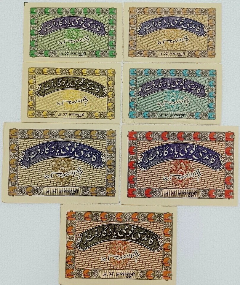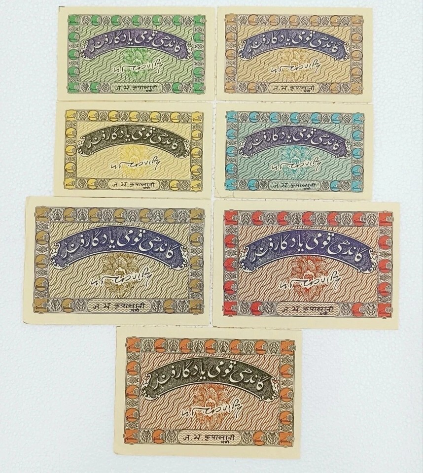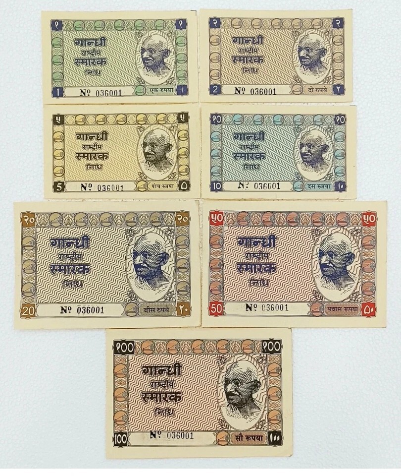 India, 1957, Gandhi-Khadi Note, 1, 2, 5, 10, 20, 50, 100 Rupees (Set of 7) UNC