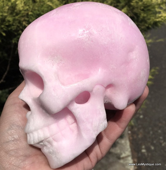 Pink ARAGONITE Skull carving. The colors range from pastel pink to bright bubble gum pink. The eyes appear to be glowing in most lighting.