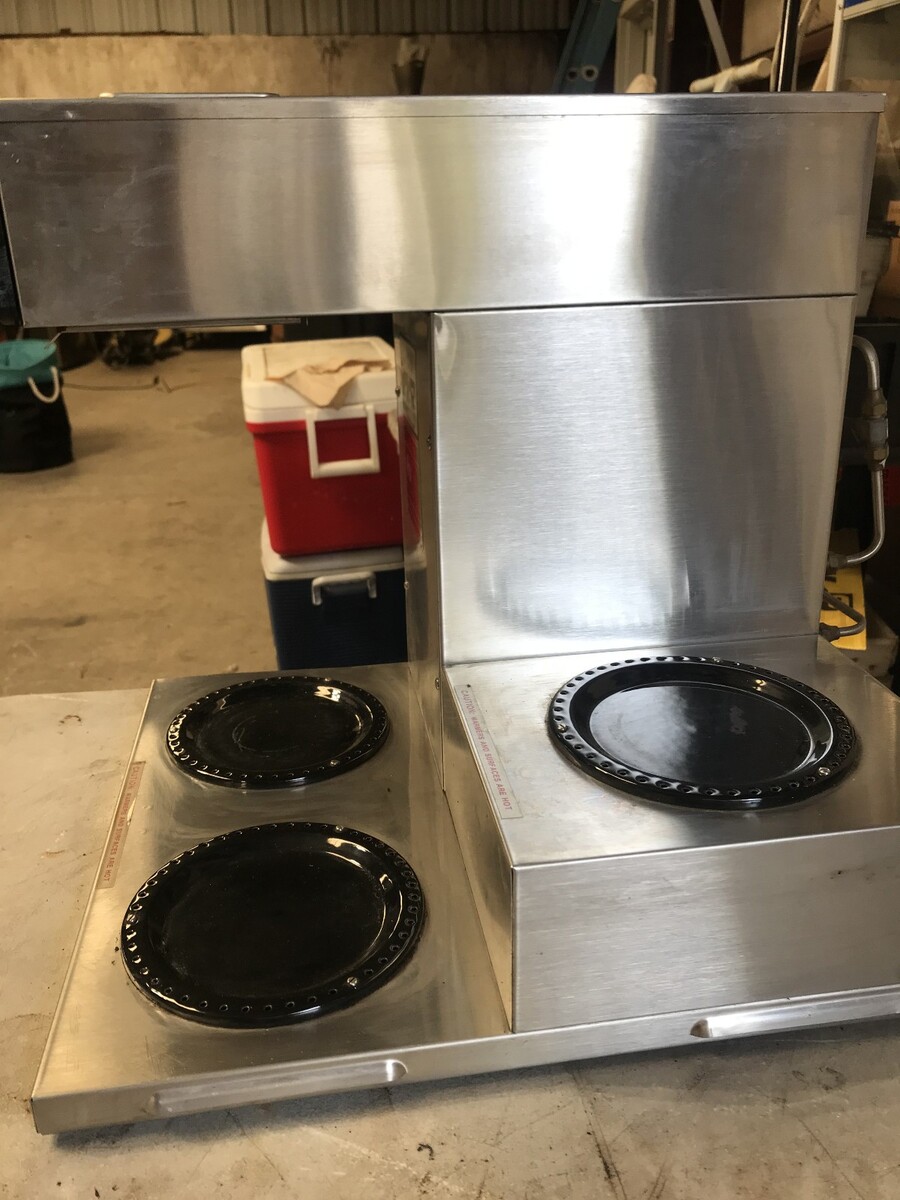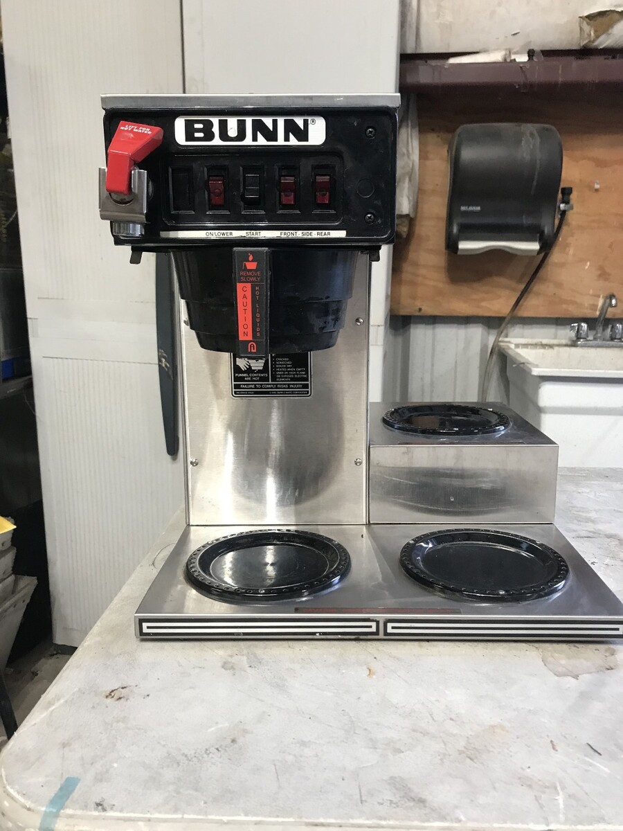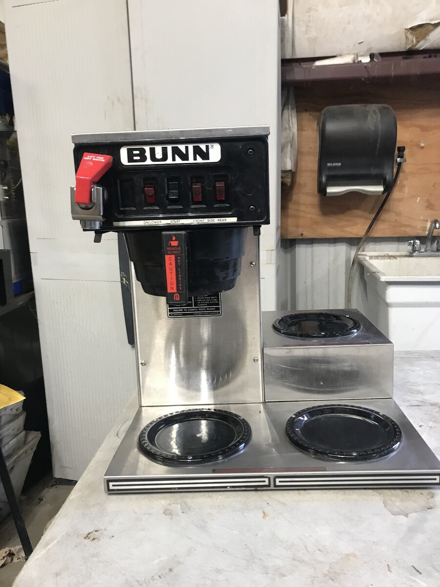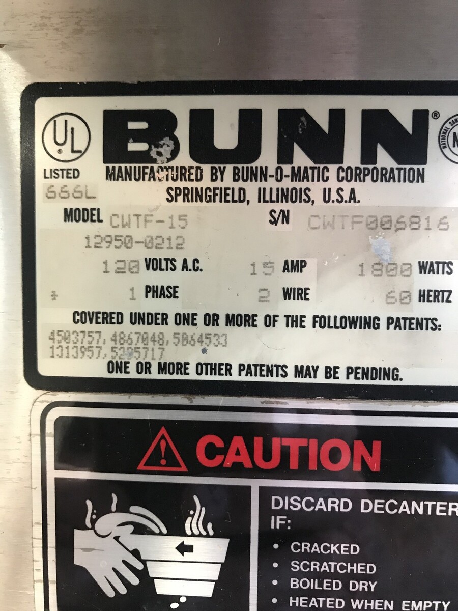 Bunn CWTF-15 coffee brewer. This brewer is designed to be a water line hook up automatic brewer It has three warming plates and a hot water tap. It shows some cosmetic wear but has been fully tested and is in perfect working condition. Overall condition is very good.