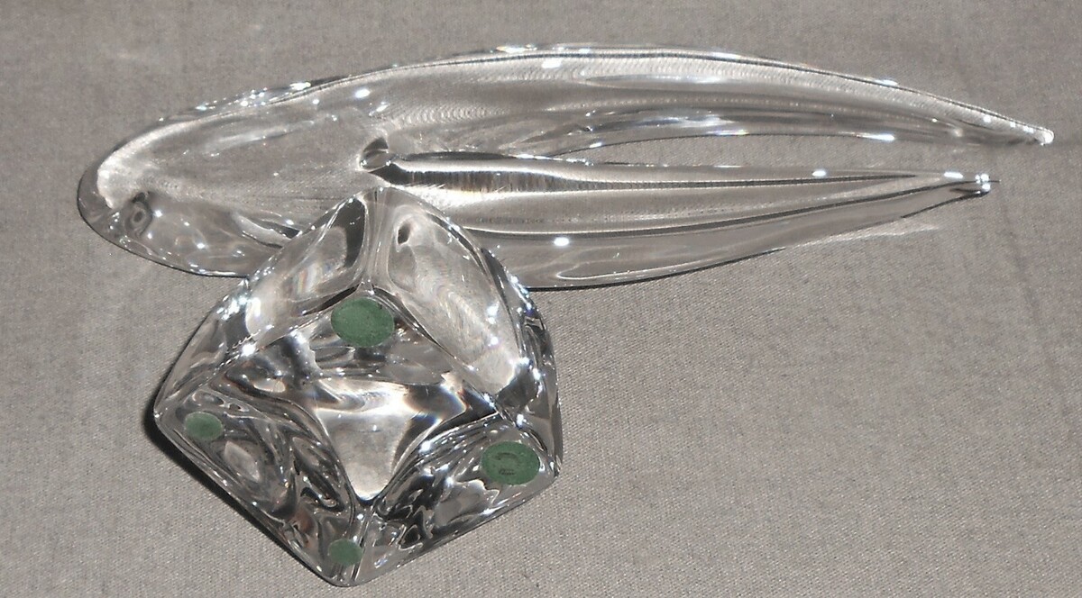 This is a beautiful Art Glass Crystal Freeform or Abstract Sculpture or Statue on a Pedestal Base which weighs 6 lbs. and is signed as shown in photo above from Daum and Made in France. It measures approx. 8" tall at tallest point and approx. 13" long at longest point and base measures approx. 3 3/8" x 3 3/8" on bottom of base. It is in great pre-owned condition with no damage. Some shadows show in photo that are from camera/background - actual sculpture is perfectly clear and even in color.