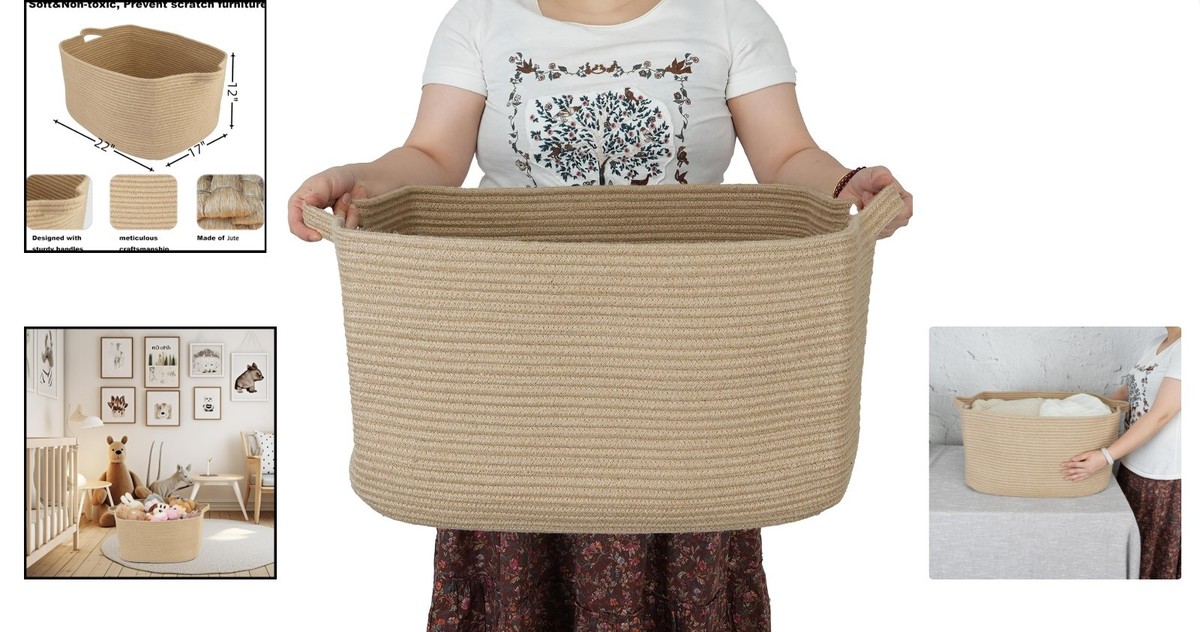 Luxurious 22x17 Inch Jute Rope Basket - Ideal for Laundry, Toys, or Blankets