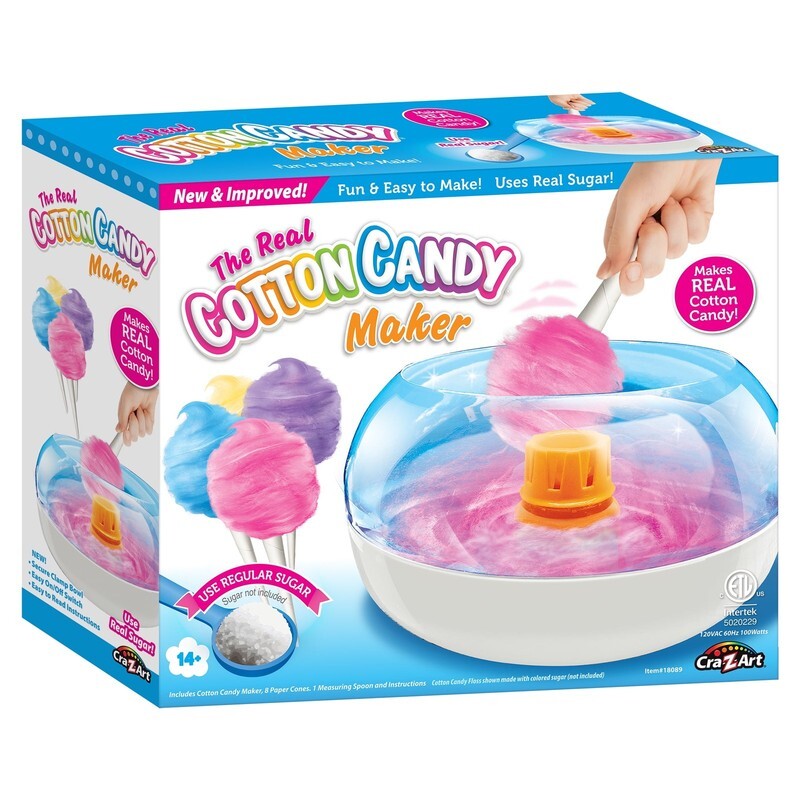 Cra-Z-Art Cotton Candy Maker allows you to turn regular fine sugar or flavored sugars into real cotton candy in minutes. Create the perfect party favor for celebrations or family events using this cotton candy maker machine! There are many ways to use customize your cotton candy; use fine sugar, look for Cra-Z-Art flavored refill kits, or use your favorite flavored fine sugar to make your own cotton candy treats. Easy to follow instructions are included or use the QR code to open the instructional video. Simple to use; place the bowl and secure the clamp, turn the switch on, wait until the unit warms up and add your fine sugar and watch before your eyes as cotton candy begins to swirl around the bowl. Use the included paper cones to swirl the cotton candy strands around and you?ll quickly have carnival style cotton candy! Easy to dissemble and clean as well; wait until the machine has cooled completely, unclamp the top bowl and hand wash or put in the dishwasher to clean. Recommended for teens ages 14 and up. Brand New Condition. Perfect for birthdays, sleepovers, pool parties, Scout meetings, Holiday fun; Christmas, Halloween, Easter, Valentine?s Day, etc. This uses about 100 watts. Look for Cra-Z-Art Cotton Candy Sugar Refill kits for flavored sugar to use with Cra-Z-Art?s Cotton Candy Maker. Includes Cotton Candy Maker, 8 paper cones, 1 measuring spoon, and easy to use instructions.