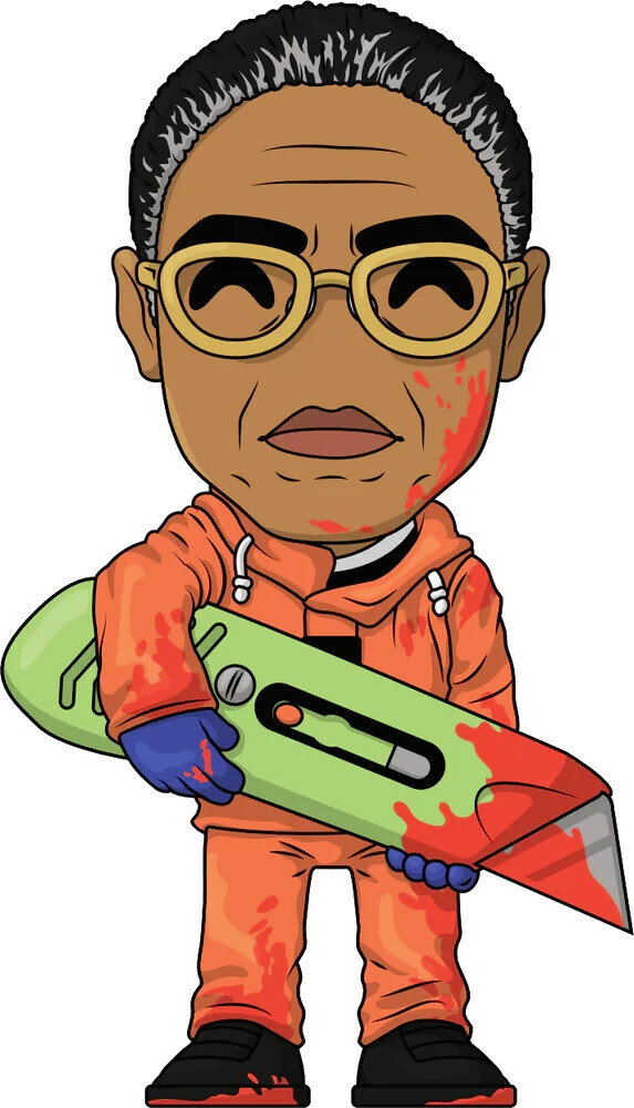 Gus Fring arrives at Youtooz! Standing at 4.6 inches, Gus has a very neutral expression on his face that contrasts heavily with the blood splatters that are decorated around his clothing. He is wearing a matching orange hoodie with orange pants and is accessorized with his gold yellow glasses. Using both hands, he is holding a huge green box cutter shaped weapon that also has red stains on the tip. The exterior of his double-walled packaging shows the empty interior of his resturant, Los Pollos Hermanos. The interior is a yellow background with the resturant's logo. This collectible ships in a matte, embossed, protective outer sleeve and a custom sized plastic protector for maximum protection during shipping.About Breaking Bad