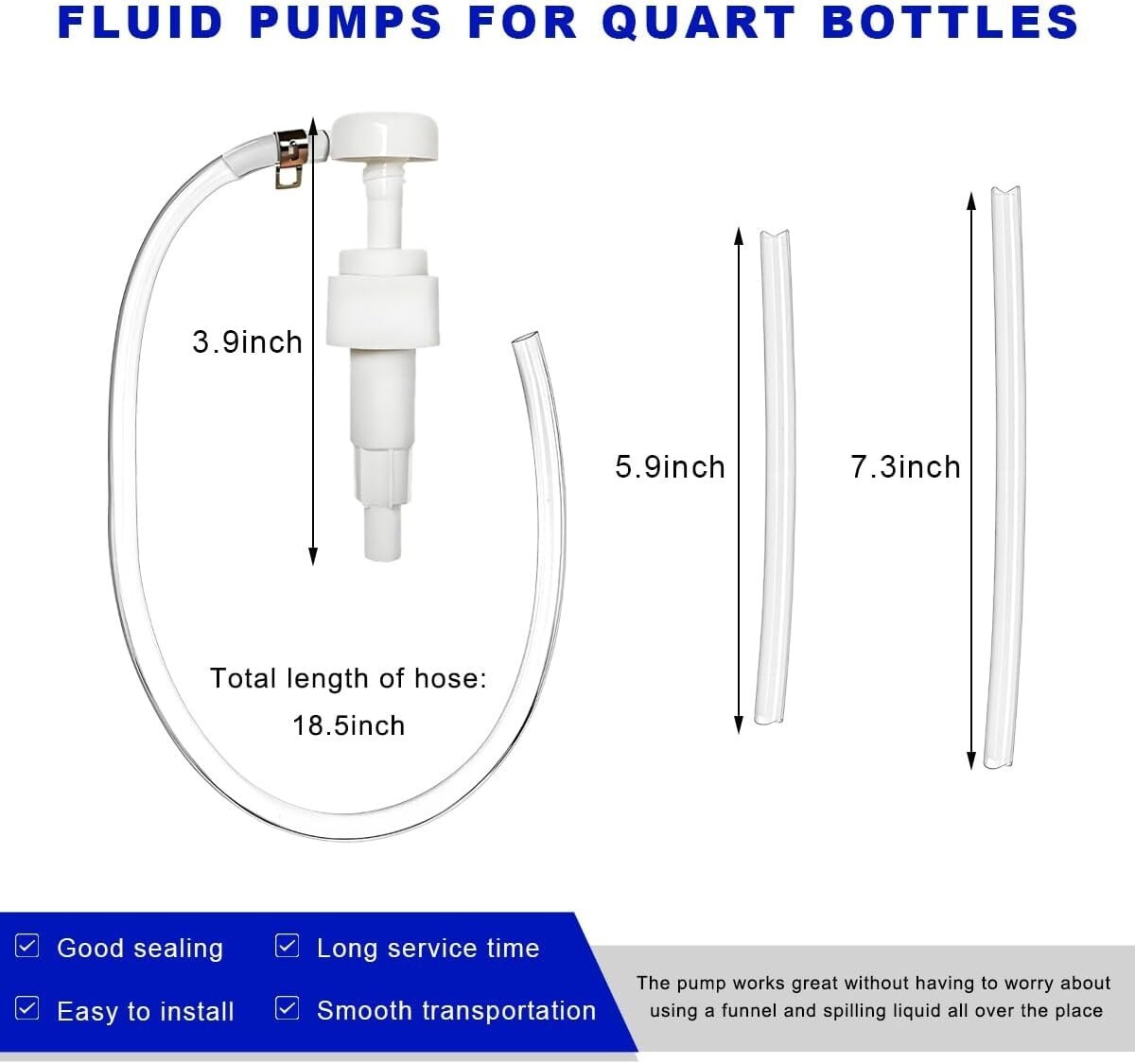 Package Includes: The set includes one 3.9-inch fluid pump with an 18.5-inch flexible hose, and two rigid intake tubes measuring 7.3 inches and 5.9 inches. This thoughtful combination supports various bottle sizes and transfer needs, offering a complete and adaptable solution for fluid handling