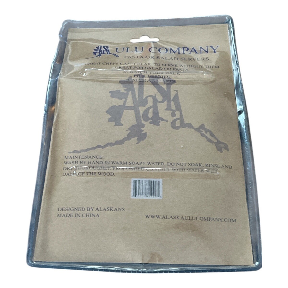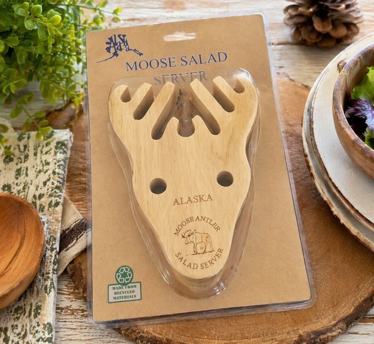 Fun and functional wooden salad server shaped like a moose head, featuring antler-style prongs and engraved Alaska design. Made by Alaska LULU Company, this novelty utensil is perfect for serving salad or pasta and adds a rustic lodge or cabin feel to your kitchen or table. Great souvenir or gift item.