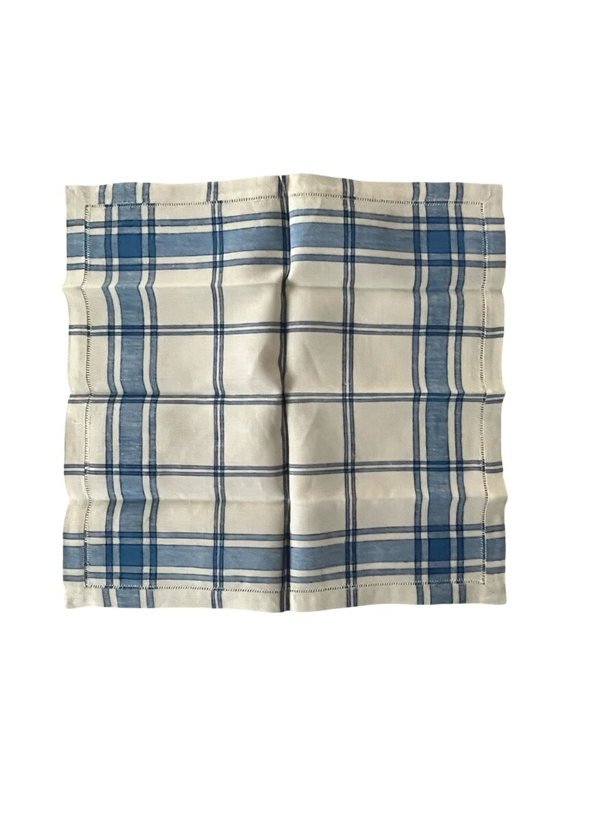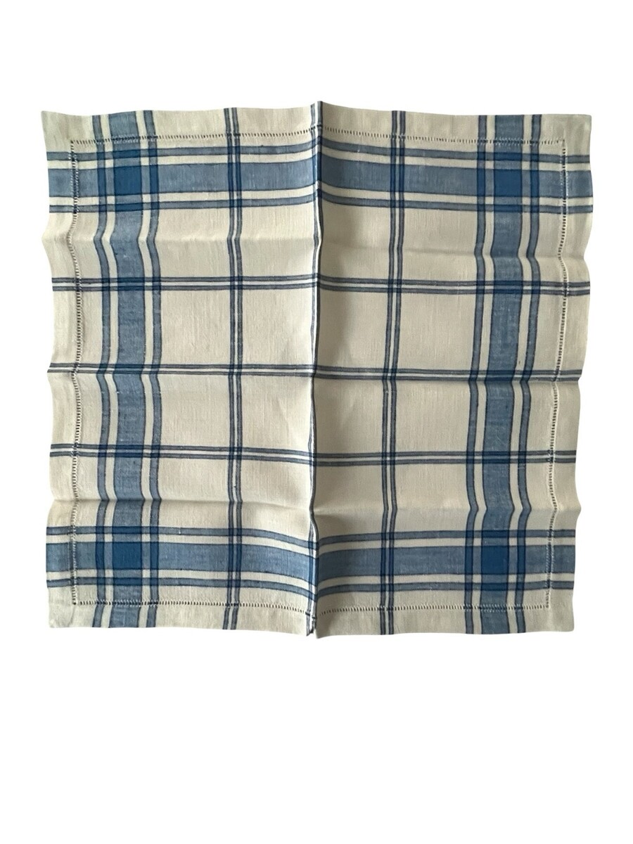 Charming vintage table linens set featuring a classic blue and cream stripe pattern with a soft, timeworn look. Includes four matching napkins and one coordinating towel, perfect for farmhouse, cottage, or rustic table settings. A versatile set for everyday use or casual entertaining.