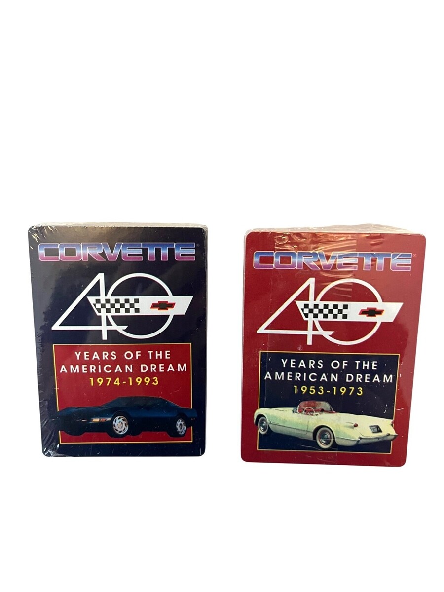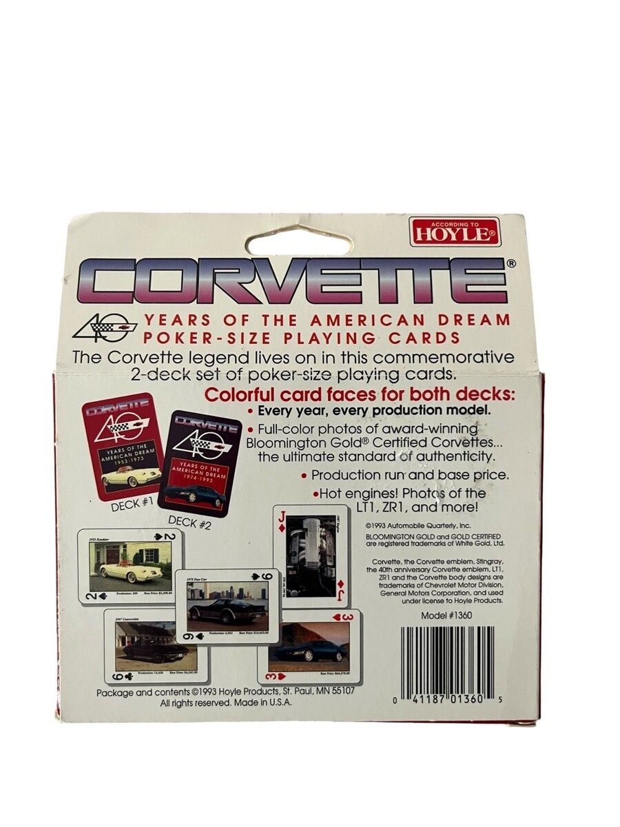 Vintage Corvette ?40 Years of the American Dream? collector playing card set by Hoyle. Includes two sealed poker-size decks featuring full-color Corvette models spanning 1953?1993. Great for collectors, card players, or Corvette enthusiasts.
