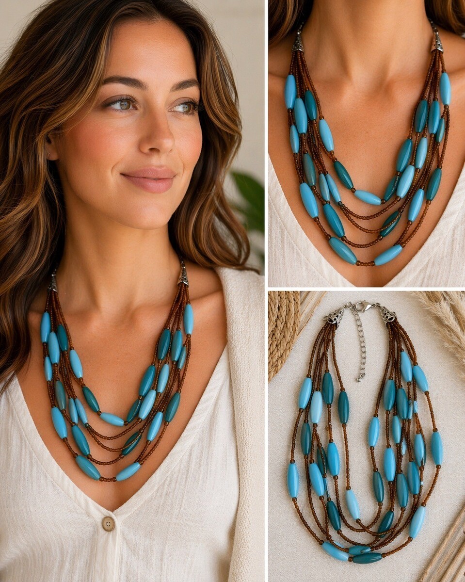 Boho-inspired Y2K multi-strand necklace featuring elongated turquoise blue beads paired with warm brown seed bead strands. The layered design creates soft movement and texture, giving it an easy, earthy look that works well with casual, beachy, or festival styles.