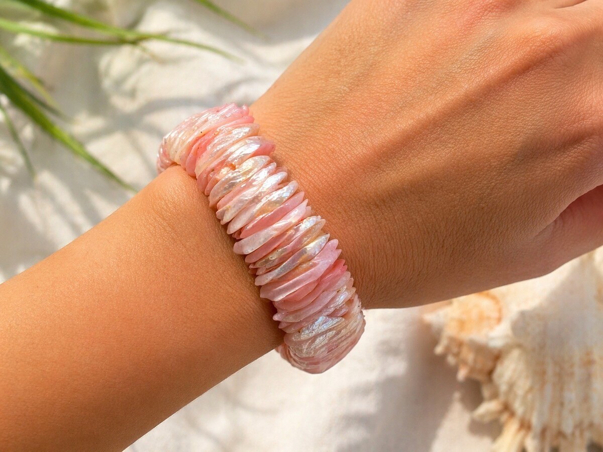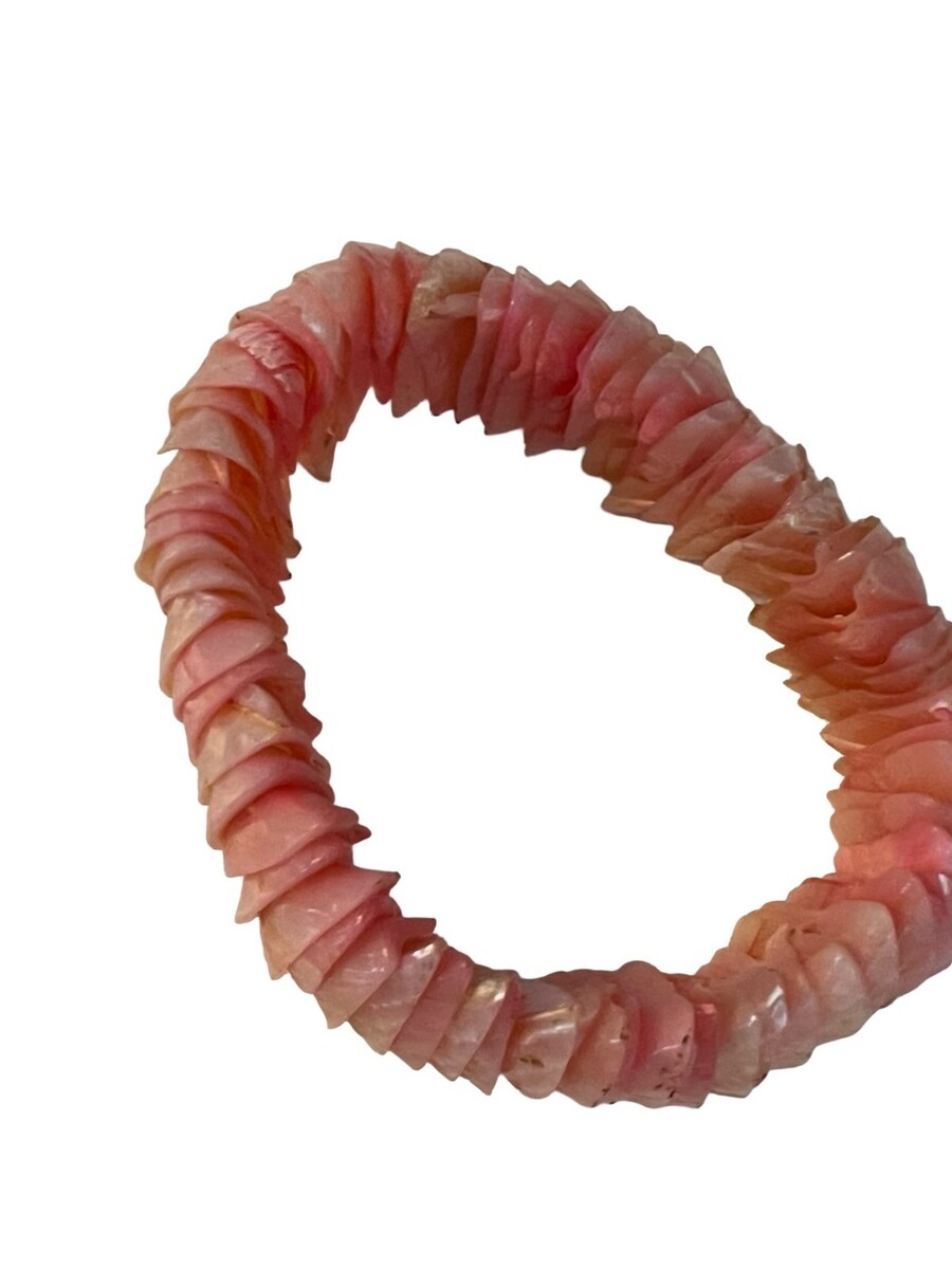 Beautiful vintage stretch bracelet featuring layered mother of pearl shell chips in soft pink and natural iridescent tones. The organic, petal-like pieces catch the light with flashes of pearl sheen, giving the bracelet a luminous, beachy elegance.