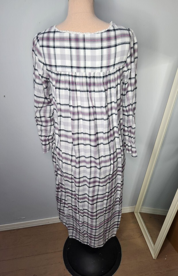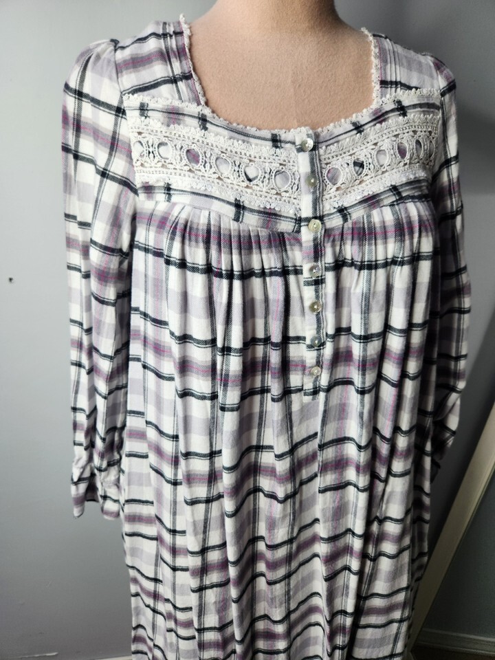 Eileen West S Soft Flannel Nightgown Long Sleeve Plaid Lace Trim Pockets NEW
