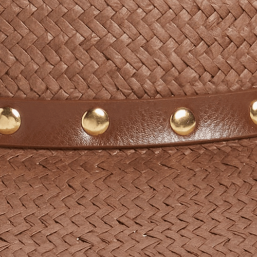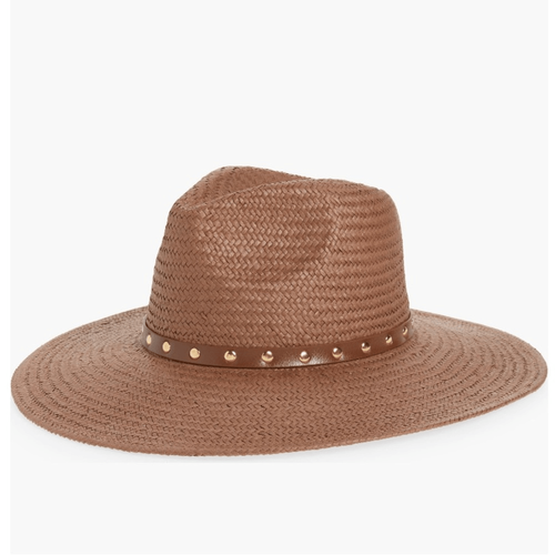 Totally fashionable and functional, this straw fedora has a wide brim and a studded leather band.