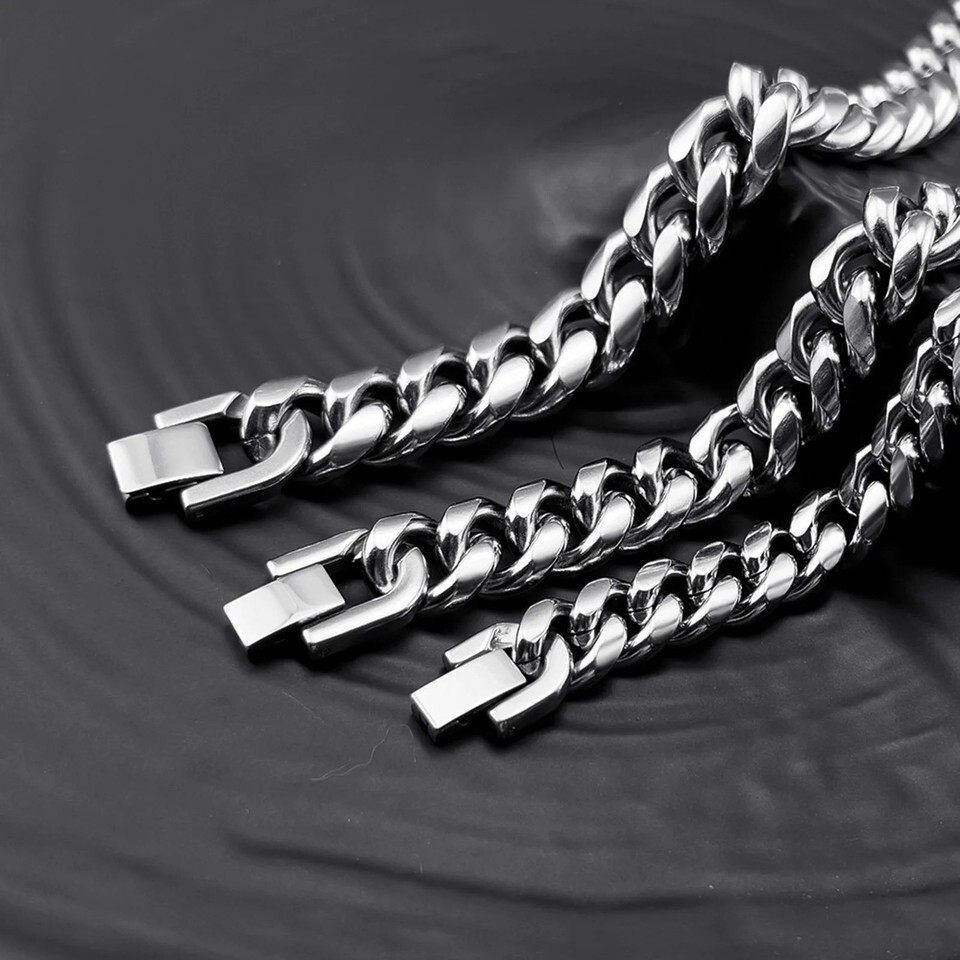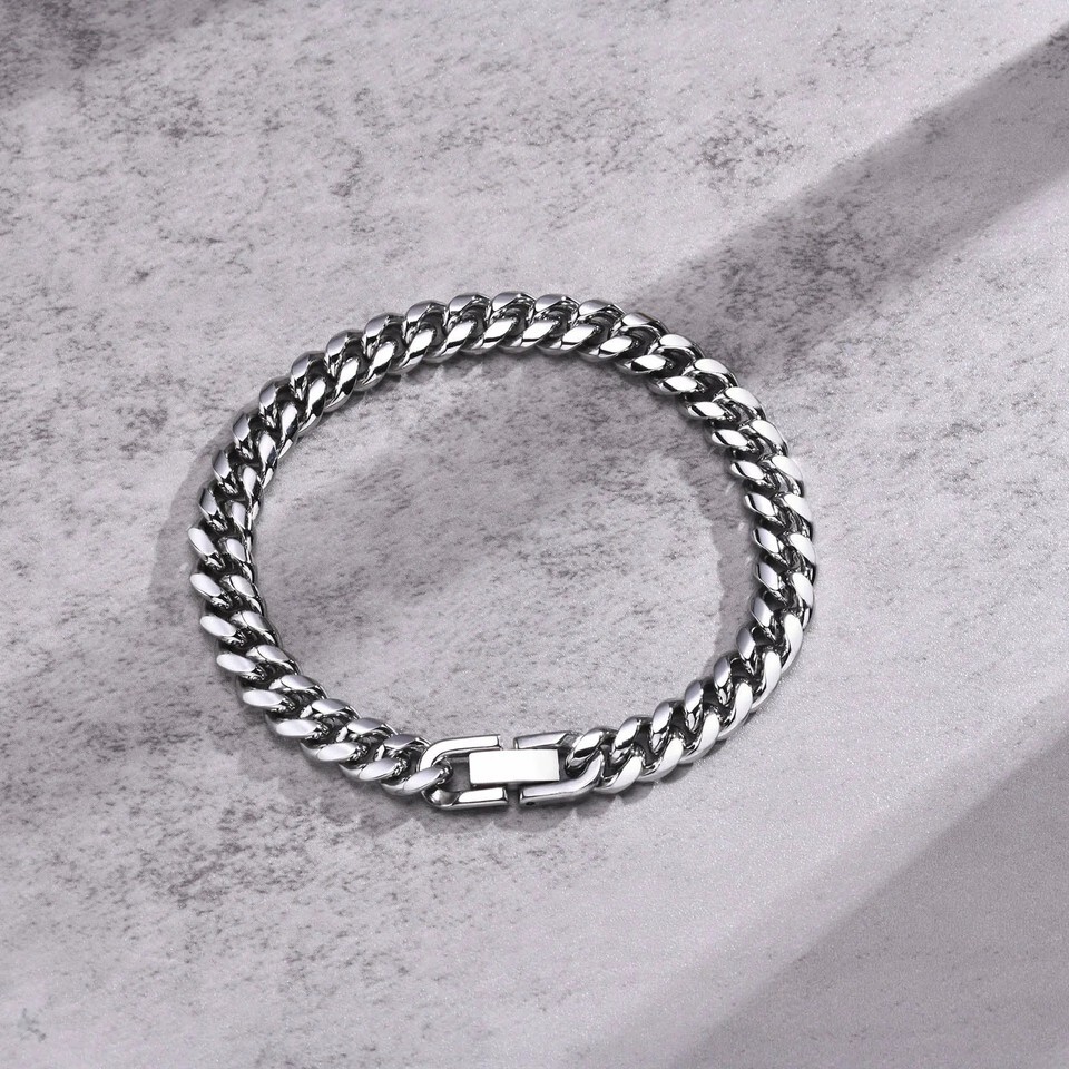 This Cuban chain bracelet is crafted from solid stainless steel with a polished silver finish. The curb link design creates a bold, textured look that catches the light. The hidden safety clasp ensures secure wear, while the tarnish-resistant material keeps it looking new for years.