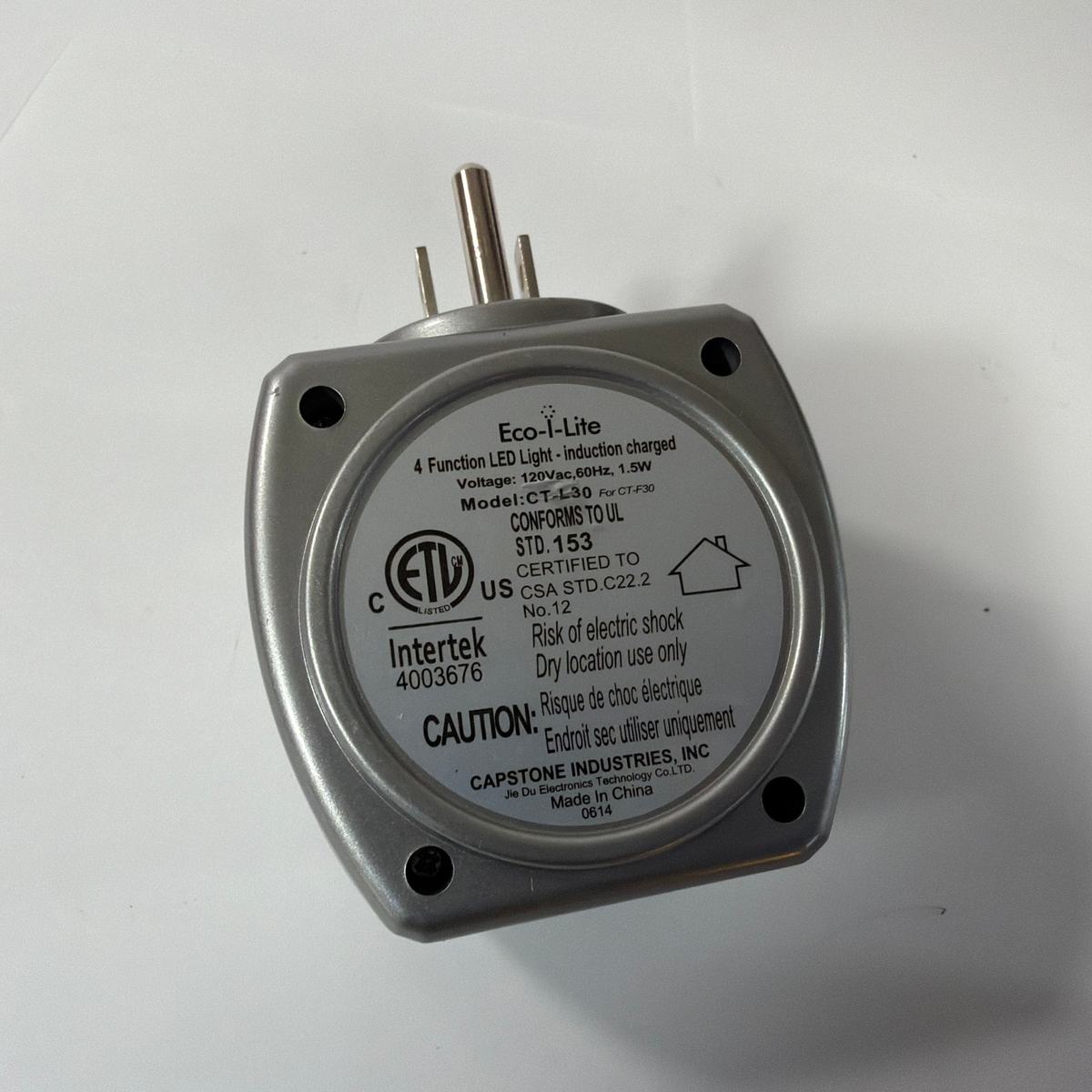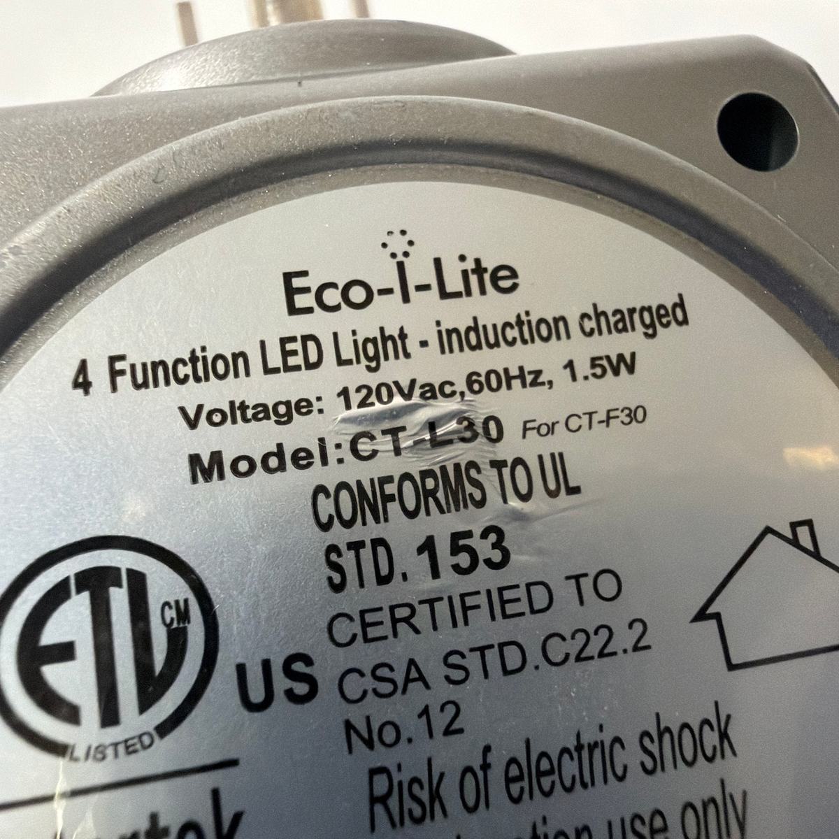 Eco-i-Lite induction charging base/charger, model CT-I30 (120Vac, 60Hz, 1.5W). Tested working. Pre-owned with light cosmetic wear such as scuffs/scratches. Includes only the charging base as shown (no flashlight/light unit included).