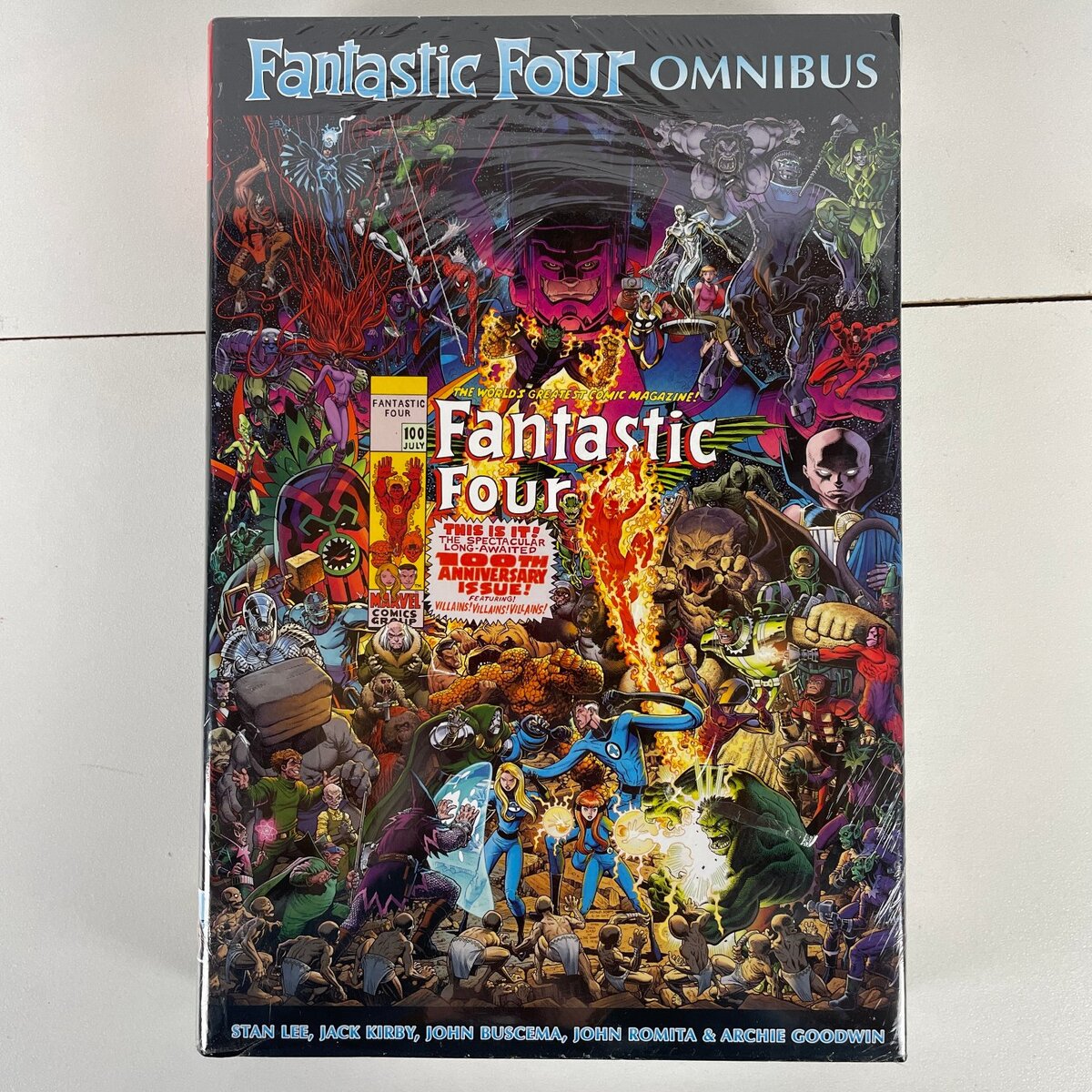 This is a Fantastic Four Omnibus 4 published by Marvel Comics, collecting a significant run of the classic superhero team. The item is an oversized hardcover edition, presented in its original polybag/shrinkwrap. This comprehensive volume features stories by legendary creators including Stan Lee, Jack Kirby, John Buscema, John Romita, and Archie Goodwin, making it a cornerstone collectible for any Marvel fan. The cover art is a vibrant collage showcasing numerous characters from the Fantastic Four universe, including Galactus, Doctor Doom, Silver Surfer, and the team themselves. This collection is a must-have for enthusiasts of classic Marvel comics and the Bronze Age of comic books.