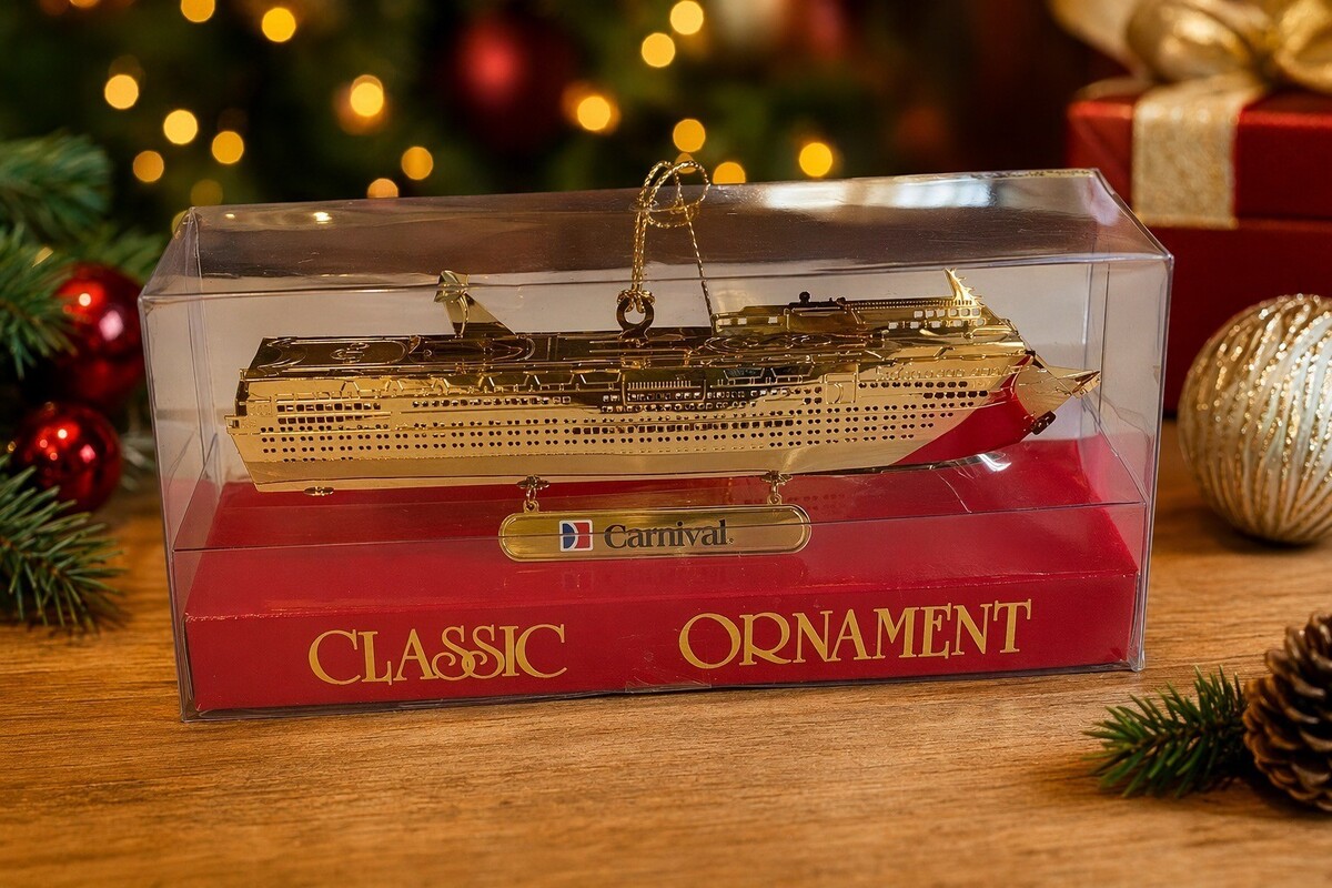 Vintage gold-tone cruise ship ornament featuring the Carnival Fantasy, housed in its original clear display case with red base labeled ?Classic Ornament.? The hanging plate is marked ?Carnival,? identifying the ship as part of the Carnival Cruise Line fleet.