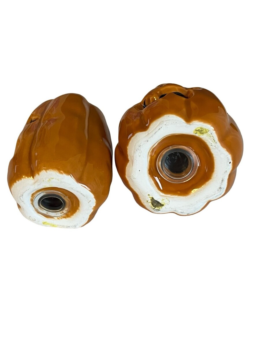 Glossy orange glaze with black facial details and brown stems. Both have fill holes on top and plastic stoppers on the bottom. Fun seasonal decor or collectible for Halloween displays.