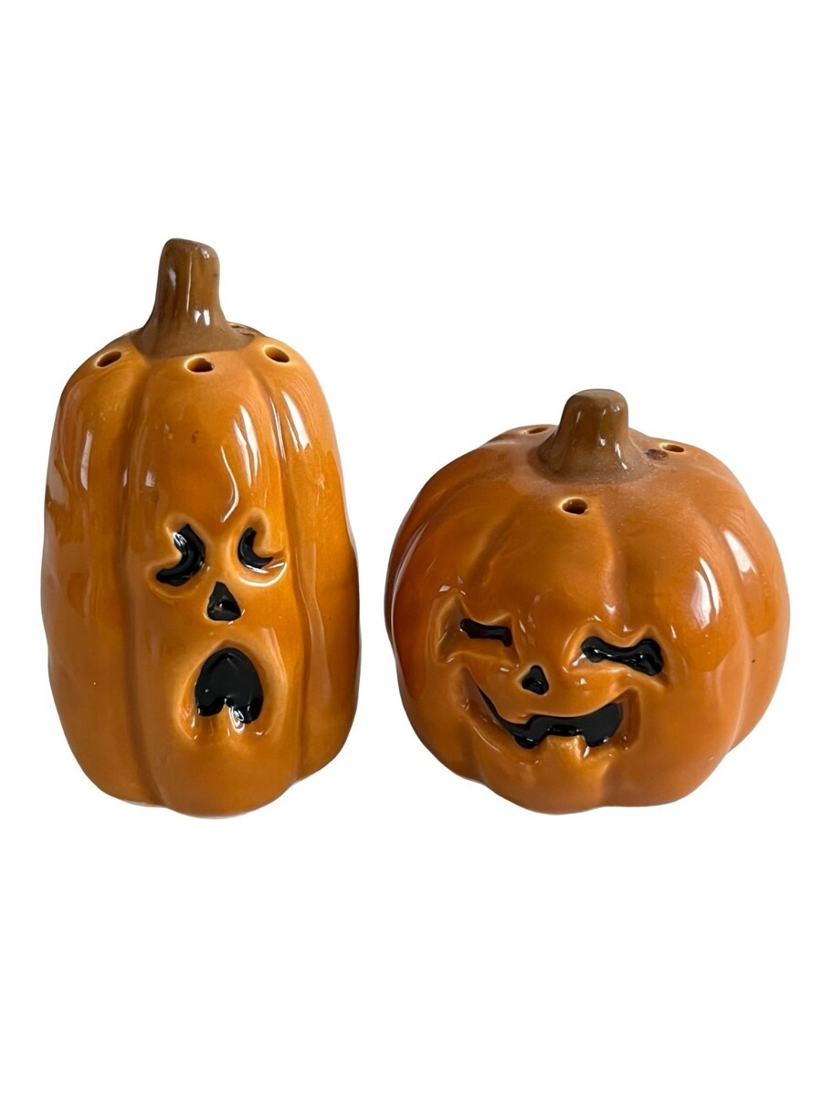 Set of 2 vintage ceramic pumpkin salt and pepper shakers featuring classic jack-o-lantern faces. Includes one tall pumpkin with a surprised expression and one shorter pumpkin with a smiling face.
