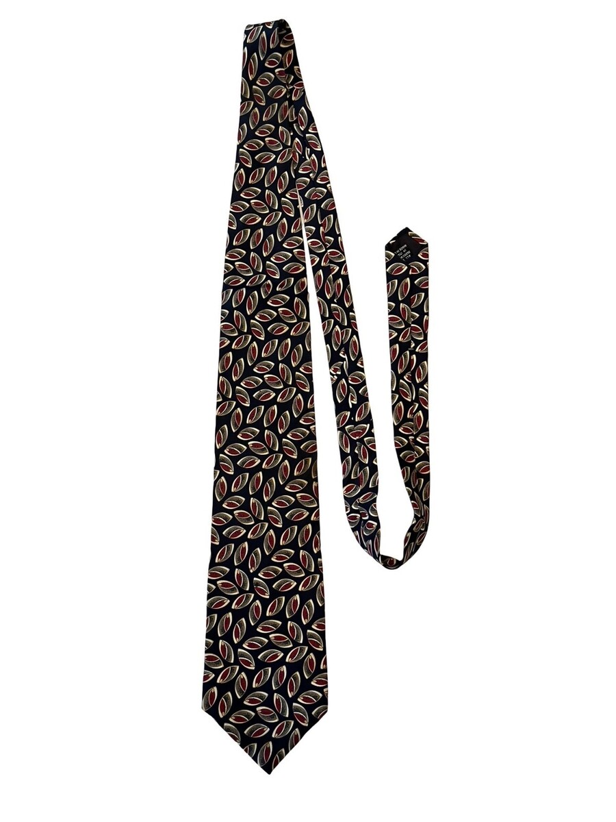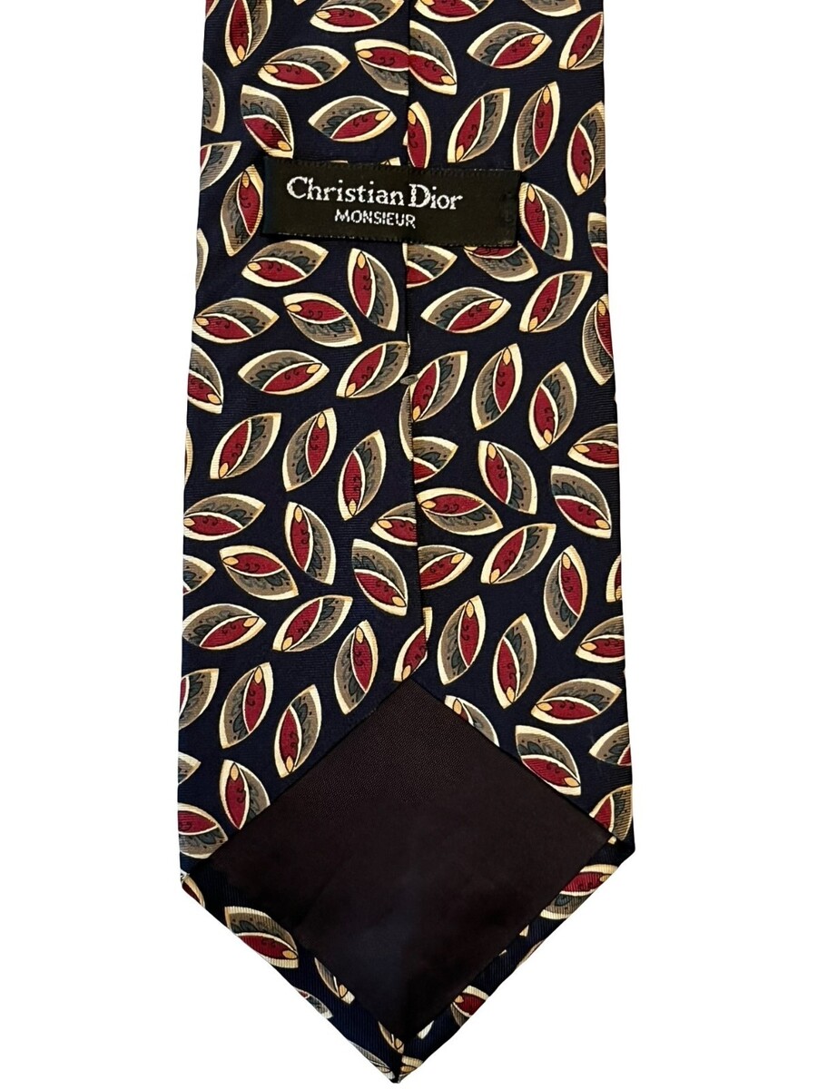Vintage Christian Dior Monsieur silk tie featuring a navy base with repeating red, gold, and gray geometric leaf-style pattern. Classic designer necktie with a timeless look, suitable for both formal and business wear.