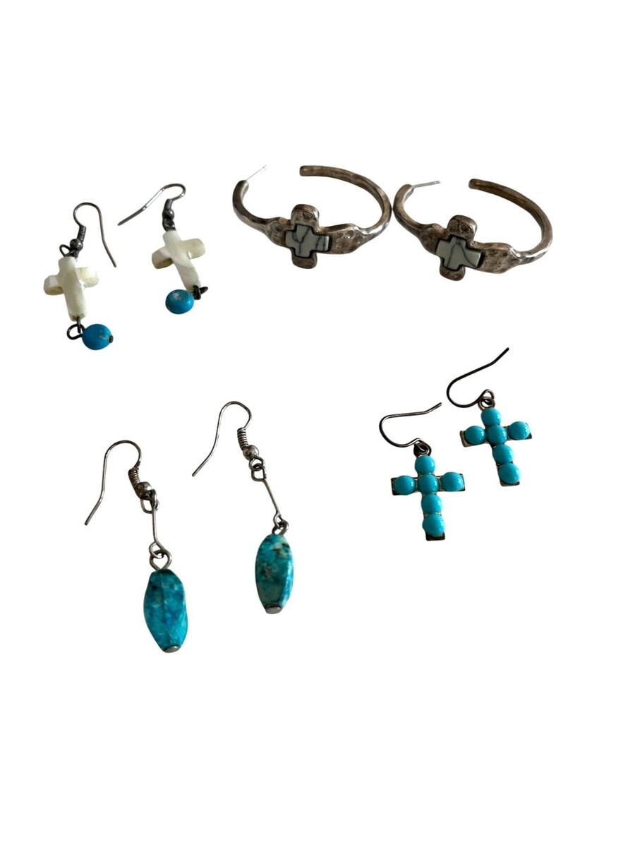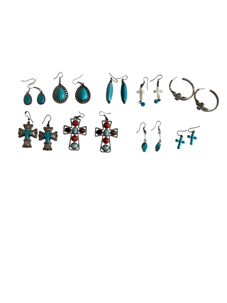 Vintage Earrings Lot 9 Pairs Southwestern Style Cross Turquoise Mixed Metal Dangle Hoop Boho Bundle
