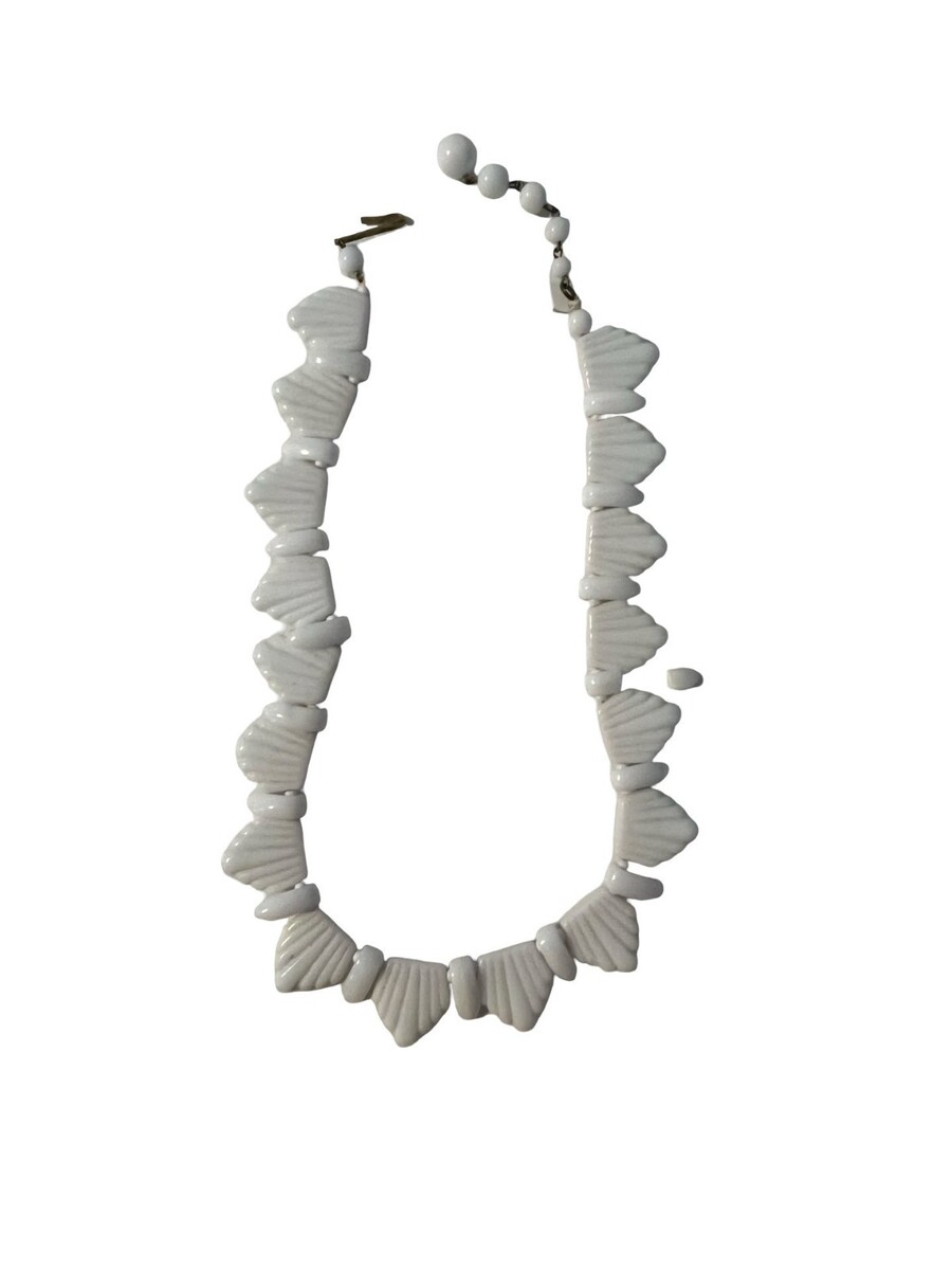 Vintage beaded necklace featuring sculpted shell style beads made of white glass