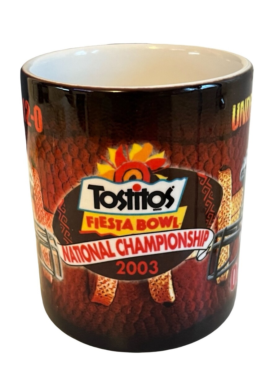 Vintage collectible coffee mug commemorating the 2003 Tostitos Fiesta Bowl National Championship game between Miami and Ohio State